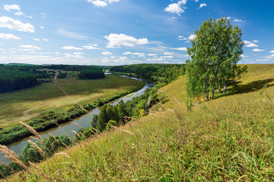 Вид на Немду с крутого берега открывается внезапно: только что вокруг были поля и тут внезапный обрыв и река внизу.