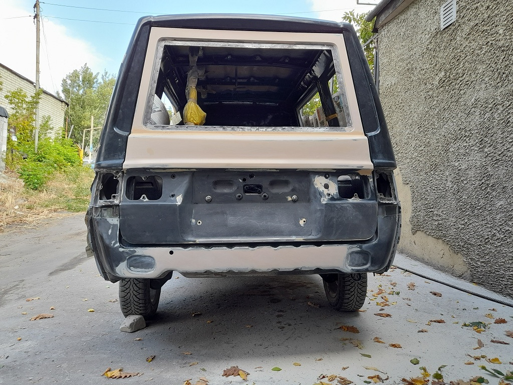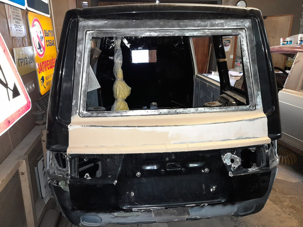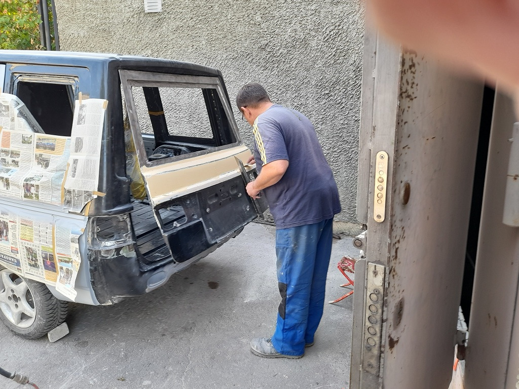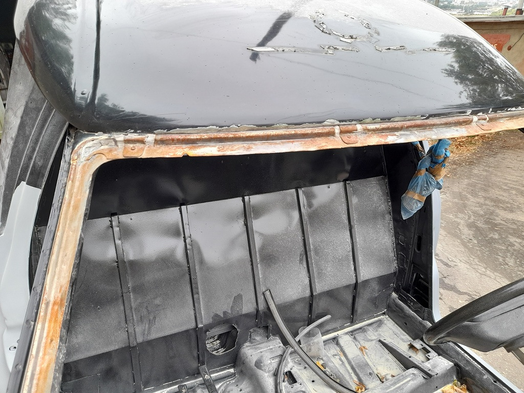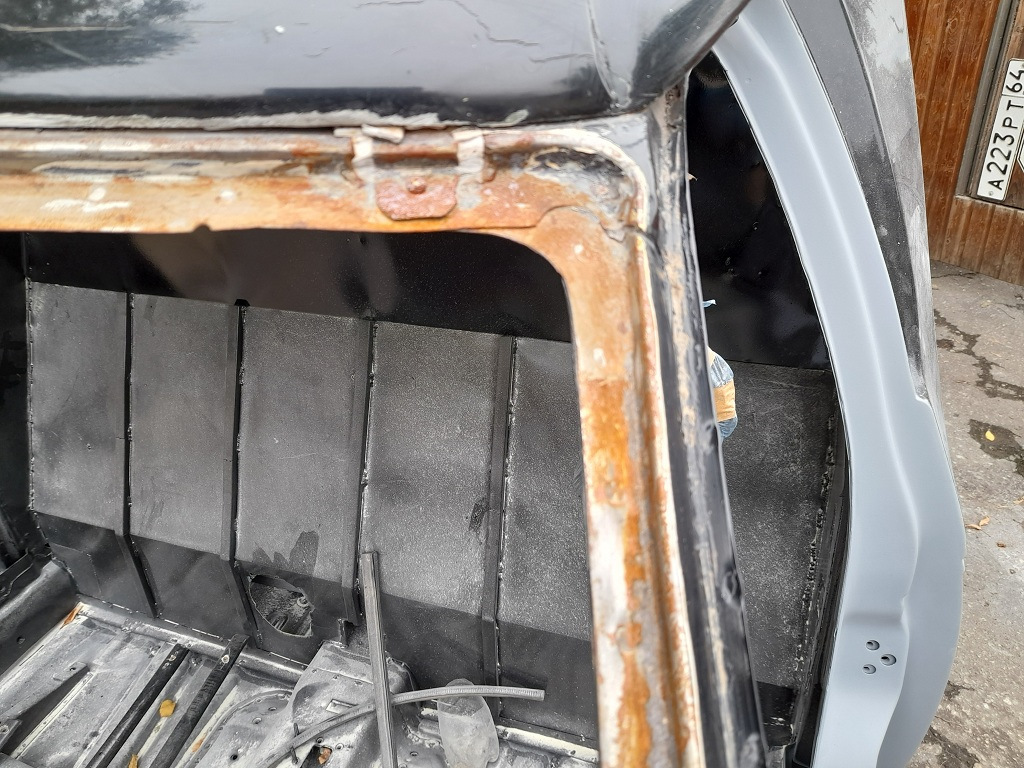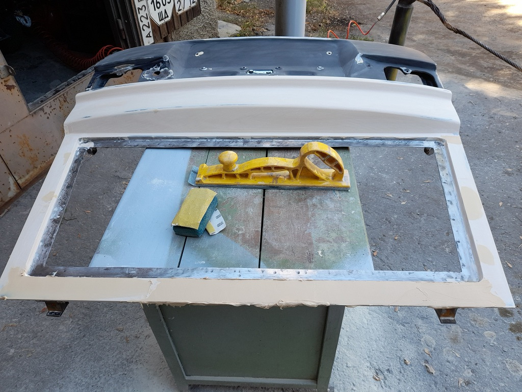 Пока на улице была чудесная погода все работы производили на свежем воздухе. Один раз, при ярком солнце, начался небольшой дождик и машину не успели закатить в гараж. Дождик был несколько минут, жара больше 30-ти, всё высохло очень быстро. Прошёл почти месяц и на зачищенных до зеркала местах появился ржавый налёт. Особенно сильно он полез на рамке ветрового окна (РВО). Поэтому следующий этап работ пришлось начинать с неё, а не с задней двери как планировалось. На данный момент РВО и задняя дверь зашпаклёваны и загрунтованы. Материалы и мастер те же. Бюджет задней двери 20 т.р. Осталась крыша. Скорее всего её будем делать уже в малярке, непосредственно перед покраской.