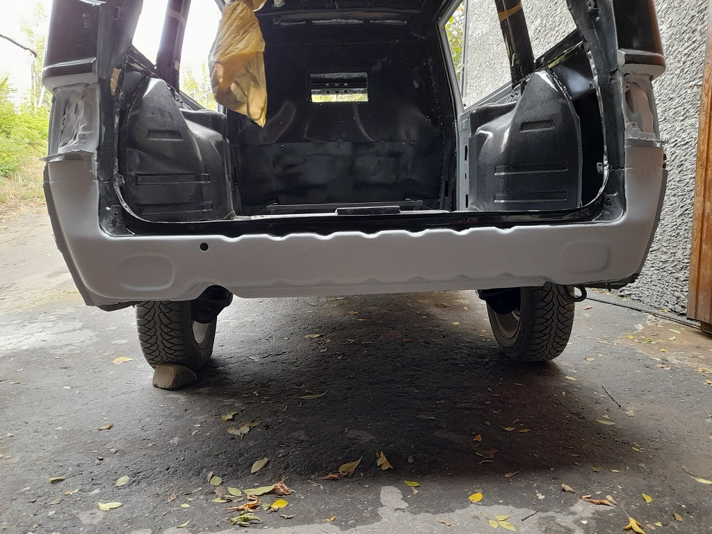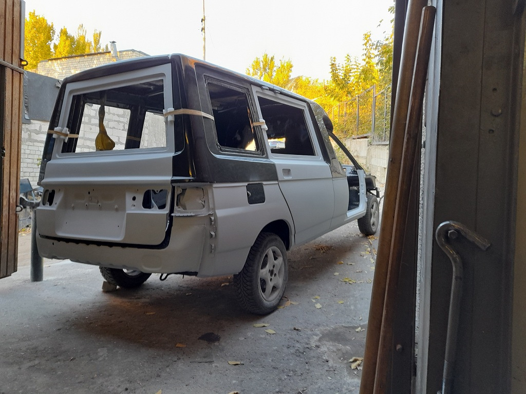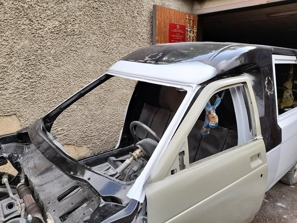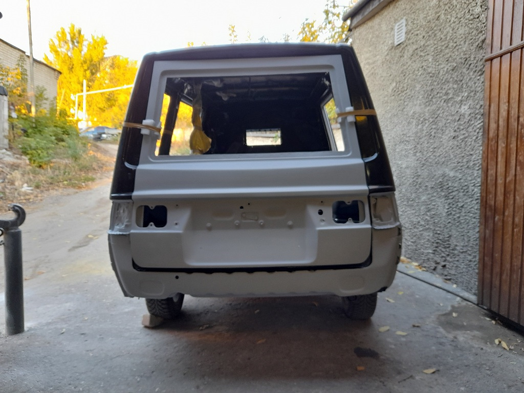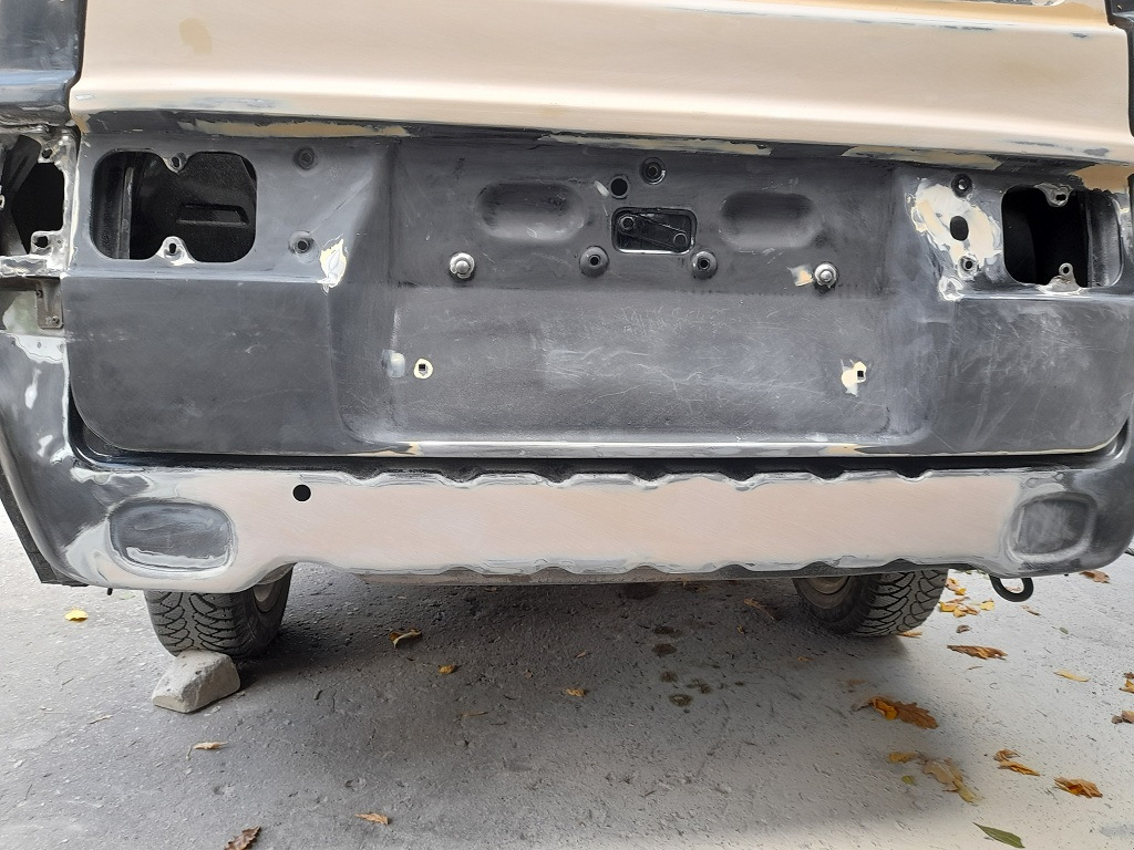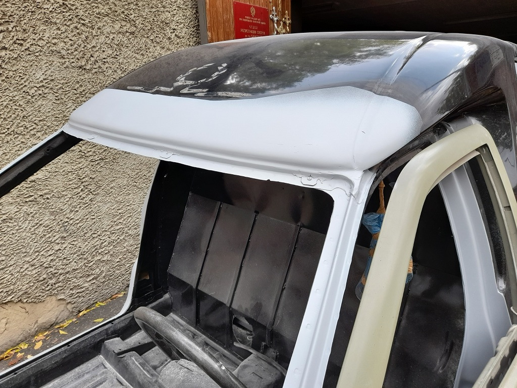 Пока на улице была чудесная погода все работы производили на свежем воздухе. Один раз, при ярком солнце, начался небольшой дождик и машину не успели закатить в гараж. Дождик был несколько минут, жара больше 30-ти, всё высохло очень быстро. Прошёл почти месяц и на зачищенных до зеркала местах появился ржавый налёт. Особенно сильно он полез на рамке ветрового окна (РВО). Поэтому следующий этап работ пришлось начинать с неё, а не с задней двери как планировалось. На данный момент РВО и задняя дверь зашпаклёваны и загрунтованы. Материалы и мастер те же. Бюджет задней двери 20 т.р. Осталась крыша. Скорее всего её будем делать уже в малярке, непосредственно перед покраской.