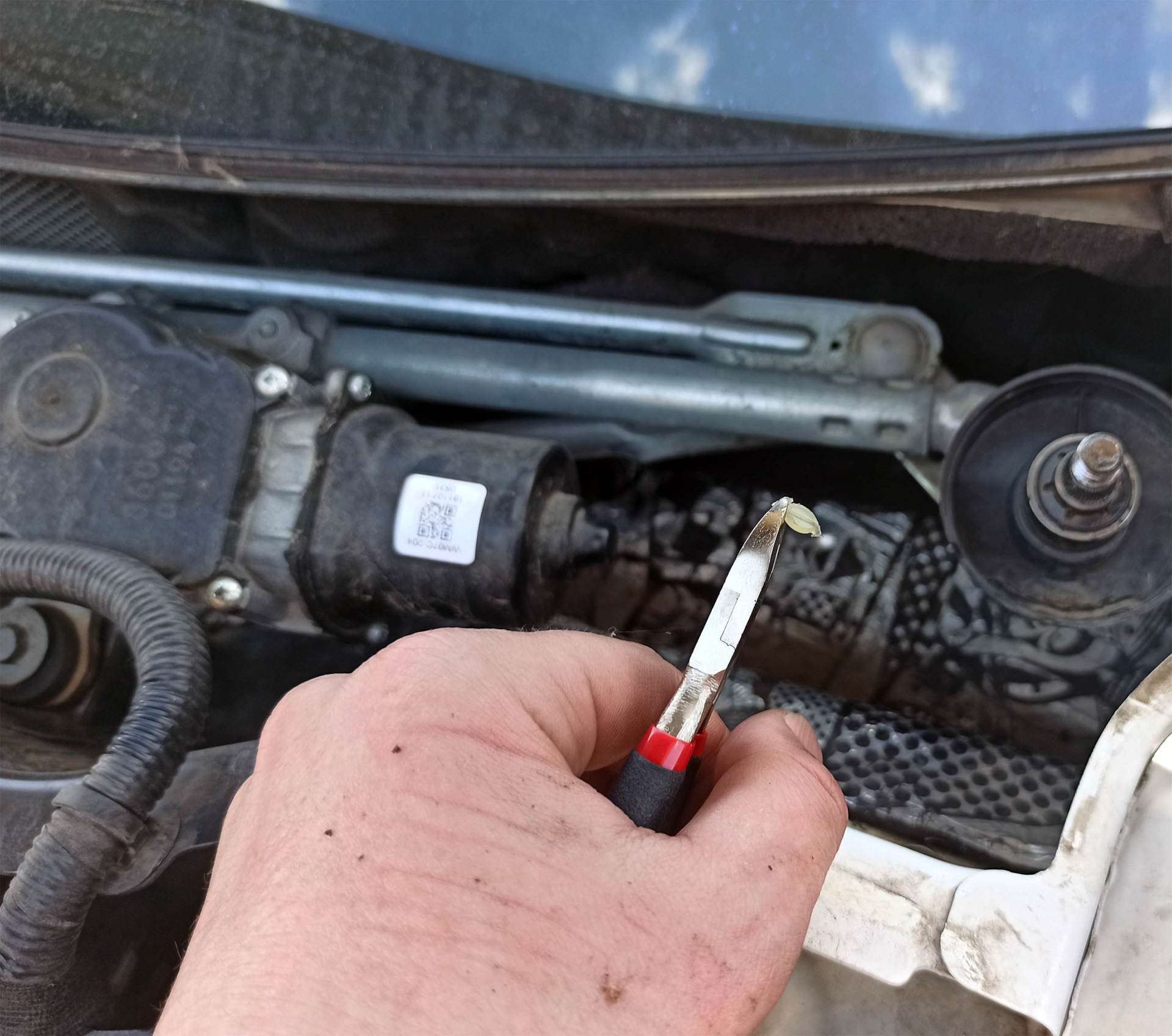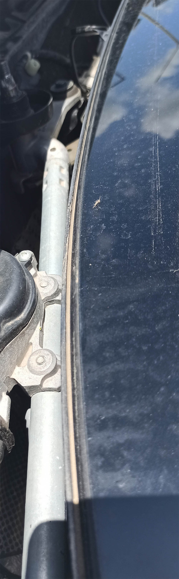 В начале лета моё терпение кончилось — на каждой мойке подтыкать вылазящее из пазов и открывающая щель жабо — известная болячка практически всех Т32 ! Вот эта щель крупным планом с уже снятыми паводками дворников: