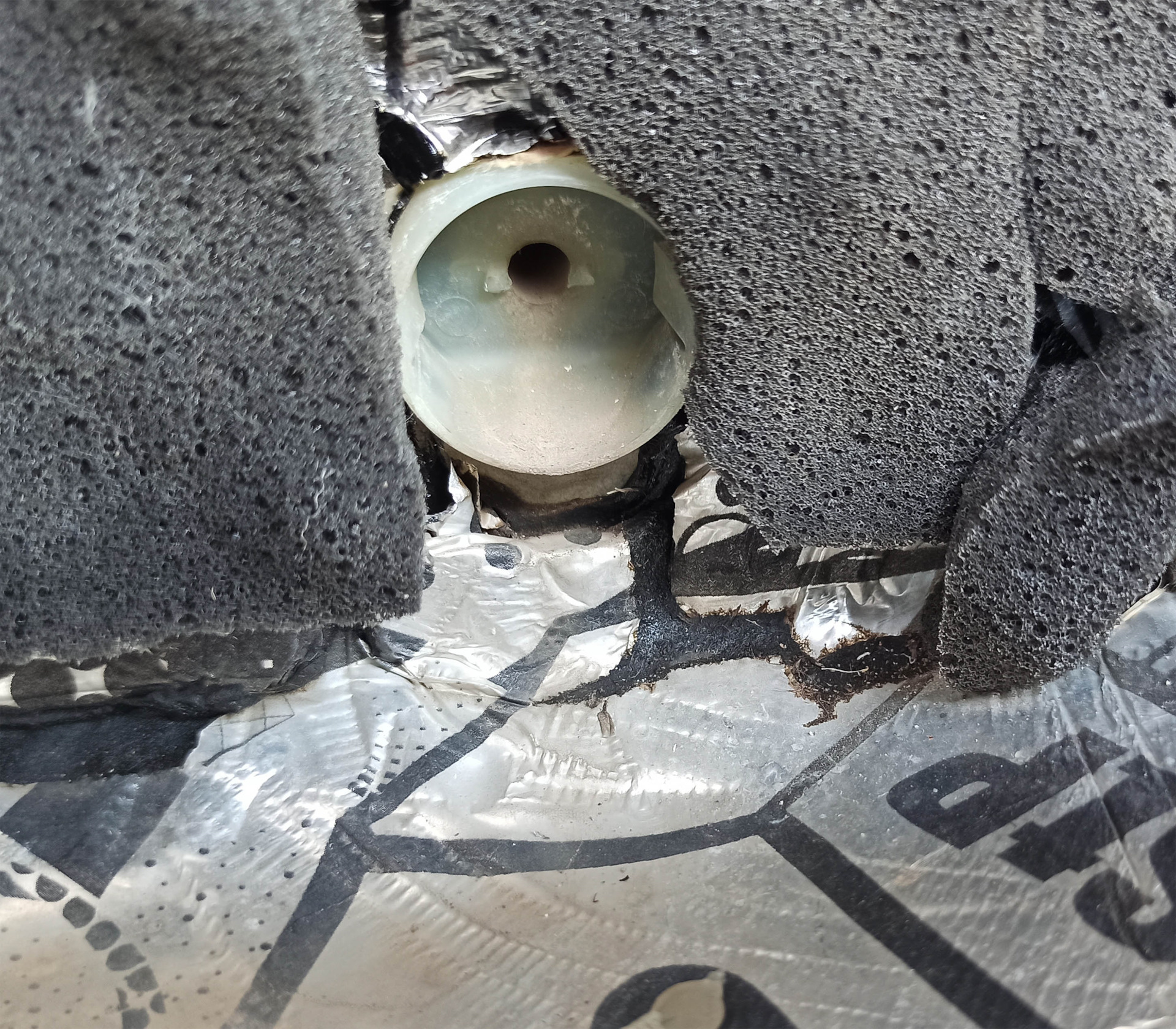 Ну почему же глупо — всё в рамках логики — когда жабо на месте, там никакой щели нет и грязь и вода в нишу между стеклом, двигателем и кузовом не попадают, о чём свидетельствует соответствующее фото с чистыми шумоизоляционными материалами, приклеенными год назад. Отвод воды происходит по бокам примерно в области стыка крыла и кузова.