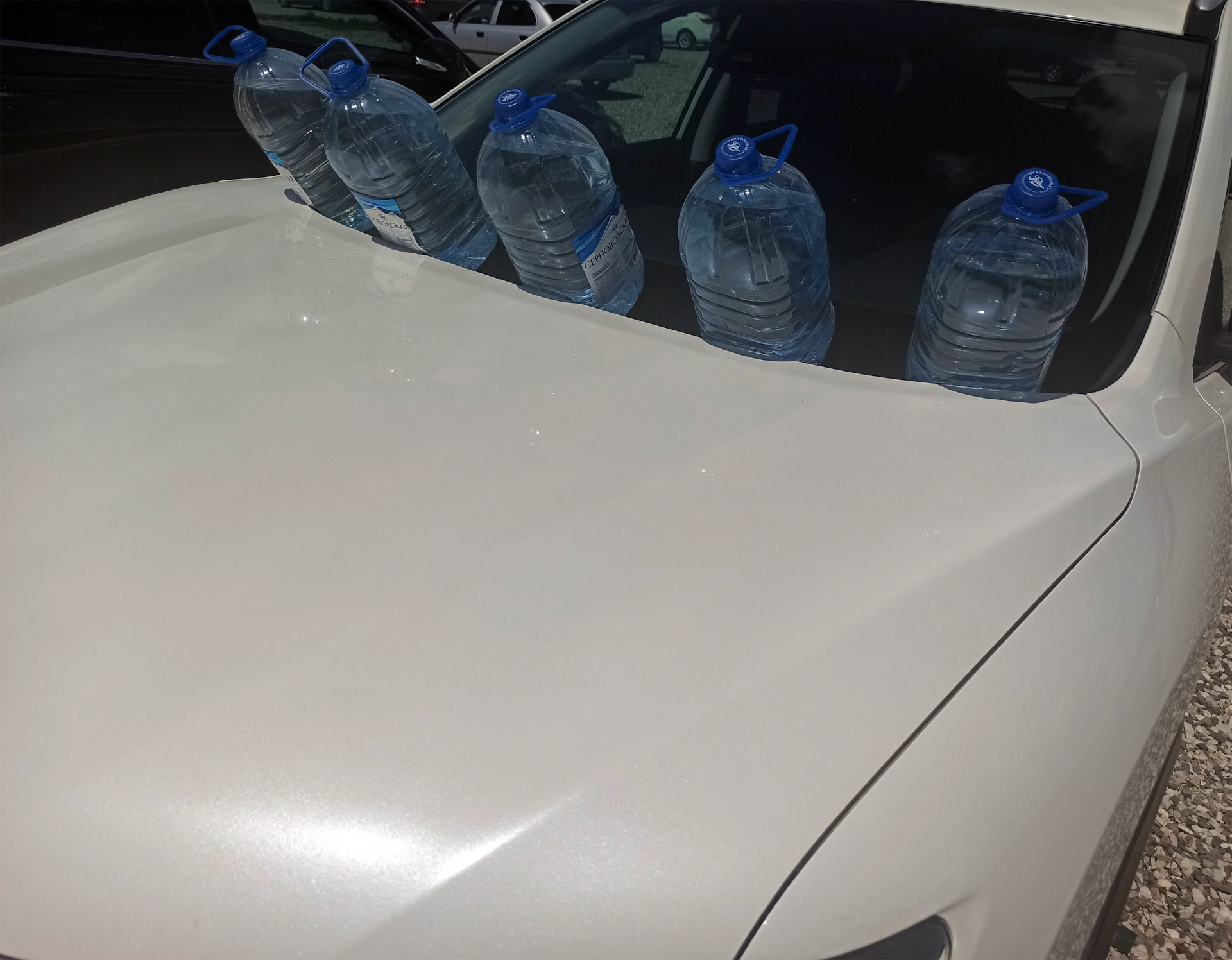 Также нанёс герметик и на саму ложбинку под стеклом. Аккуратно, чтобы ничего не запачкать установил на место жабо и привалил сверху 5л баклажками с водой (увидел этот способ на Драйве — класс придумано!) и оставил на ночь: