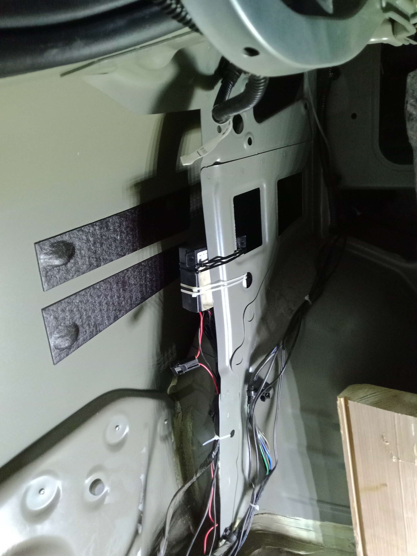 По ходу нашел под снятой обшивкой ПЕРВЫЙ косяк криворуких установщиков парктроника. Установщики официального дилера, т.к. парктроник и сигналку ставили в салоне. Блок парктроника прилеплен на 2-хсторонний скотч вот так