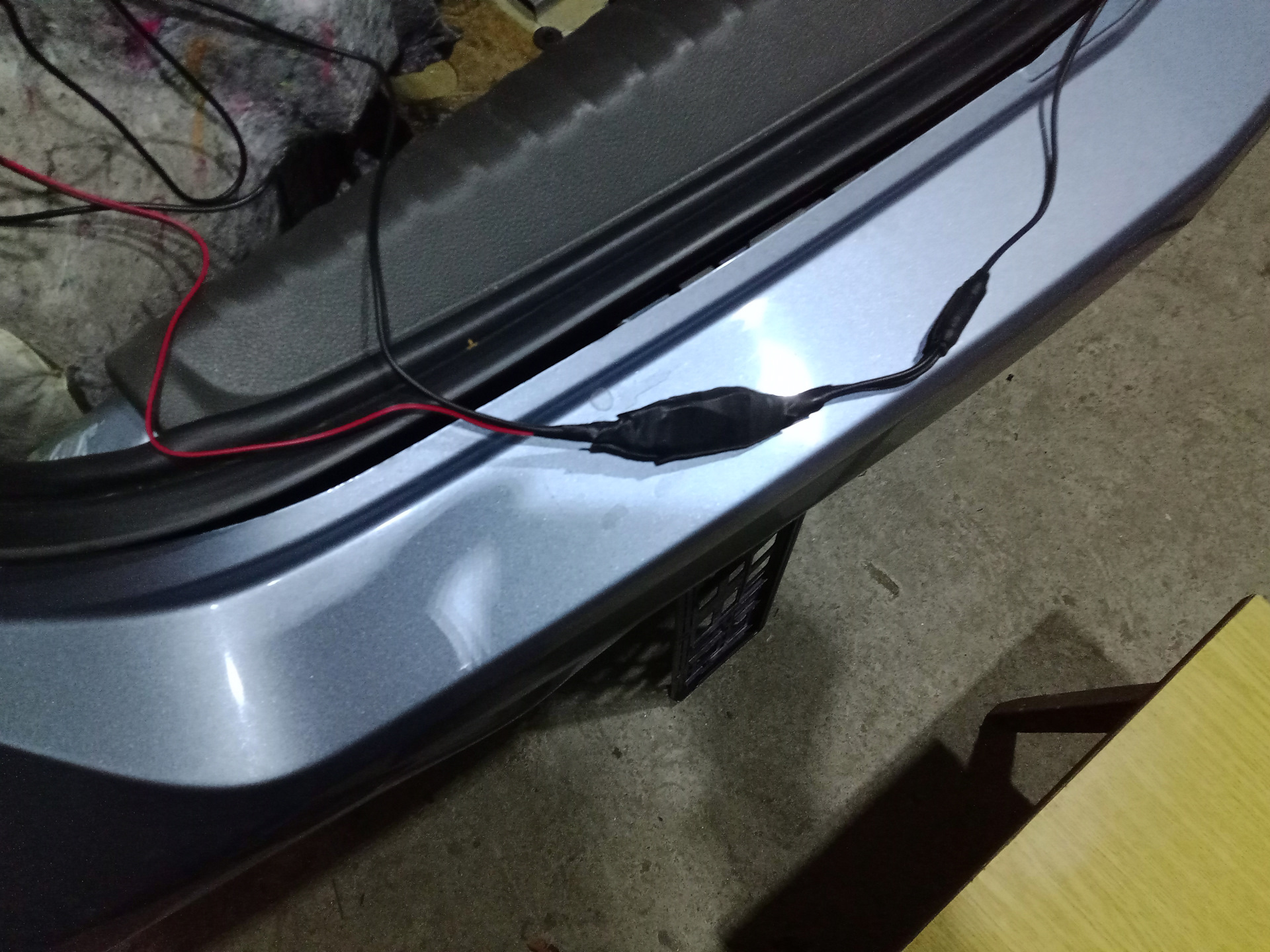 Прочел в комментариях, что цеплять «минус» к черному проводу заднего фонаря «не айс», т.к. будут помехи при нажатии на стоп. Просверлил отверстие, зачистил вокруг до металла, поставил клемму, зажал винтом и закрасил нитролаком для ногтей (дочка отдала ))) ). На фото видно по голубому цвету лака. «+» питания брал на зелено-белом проводе к фонарю.