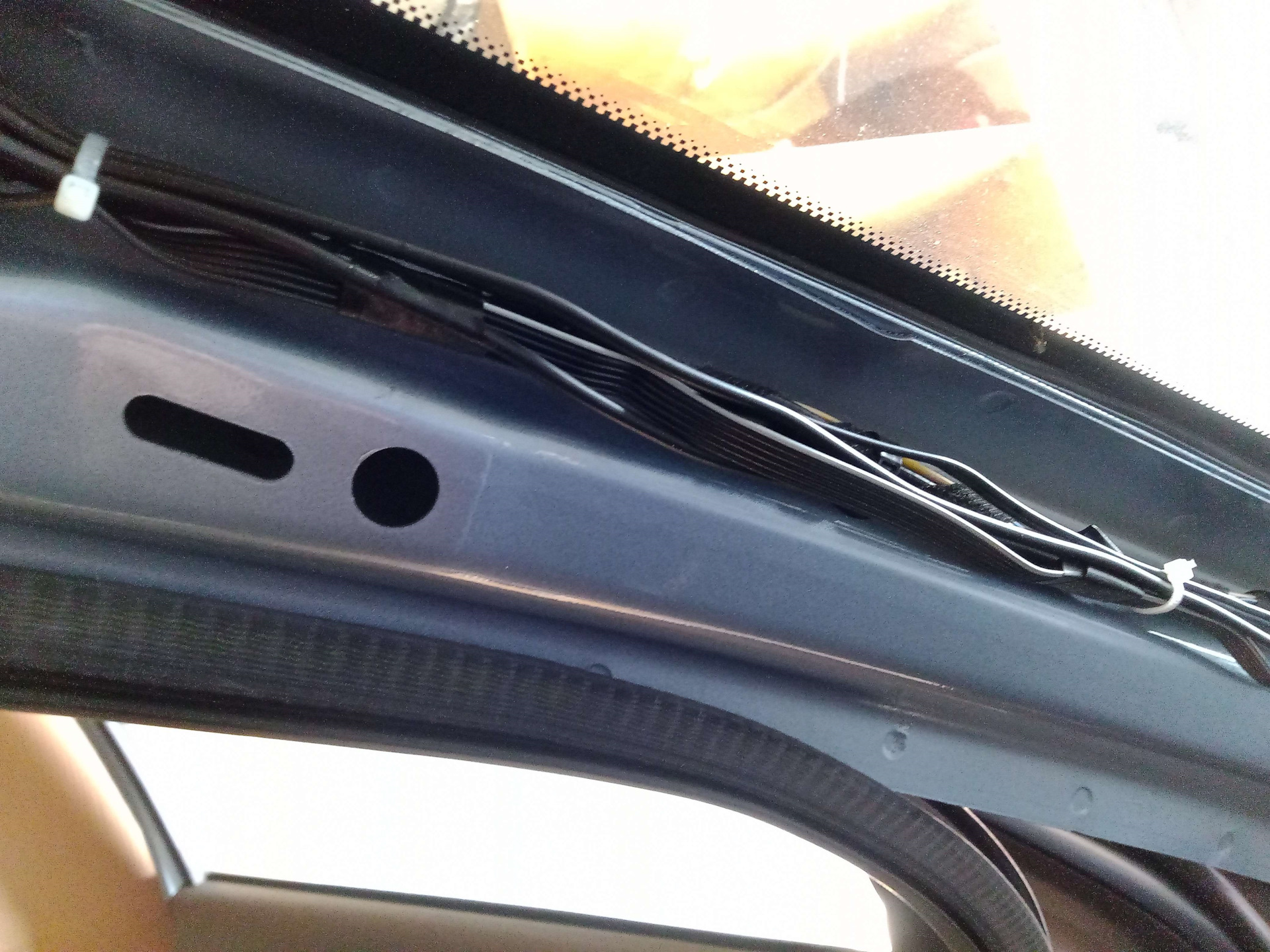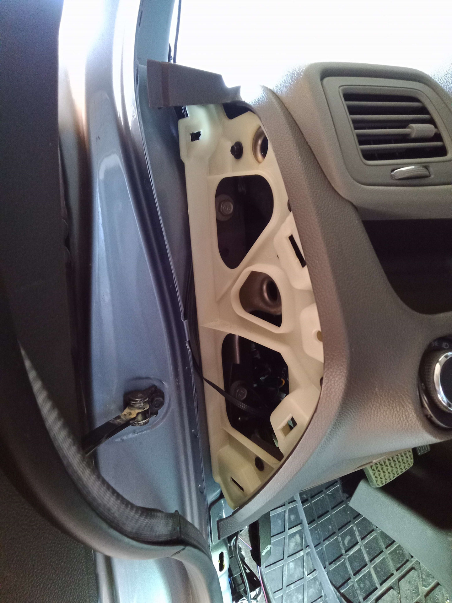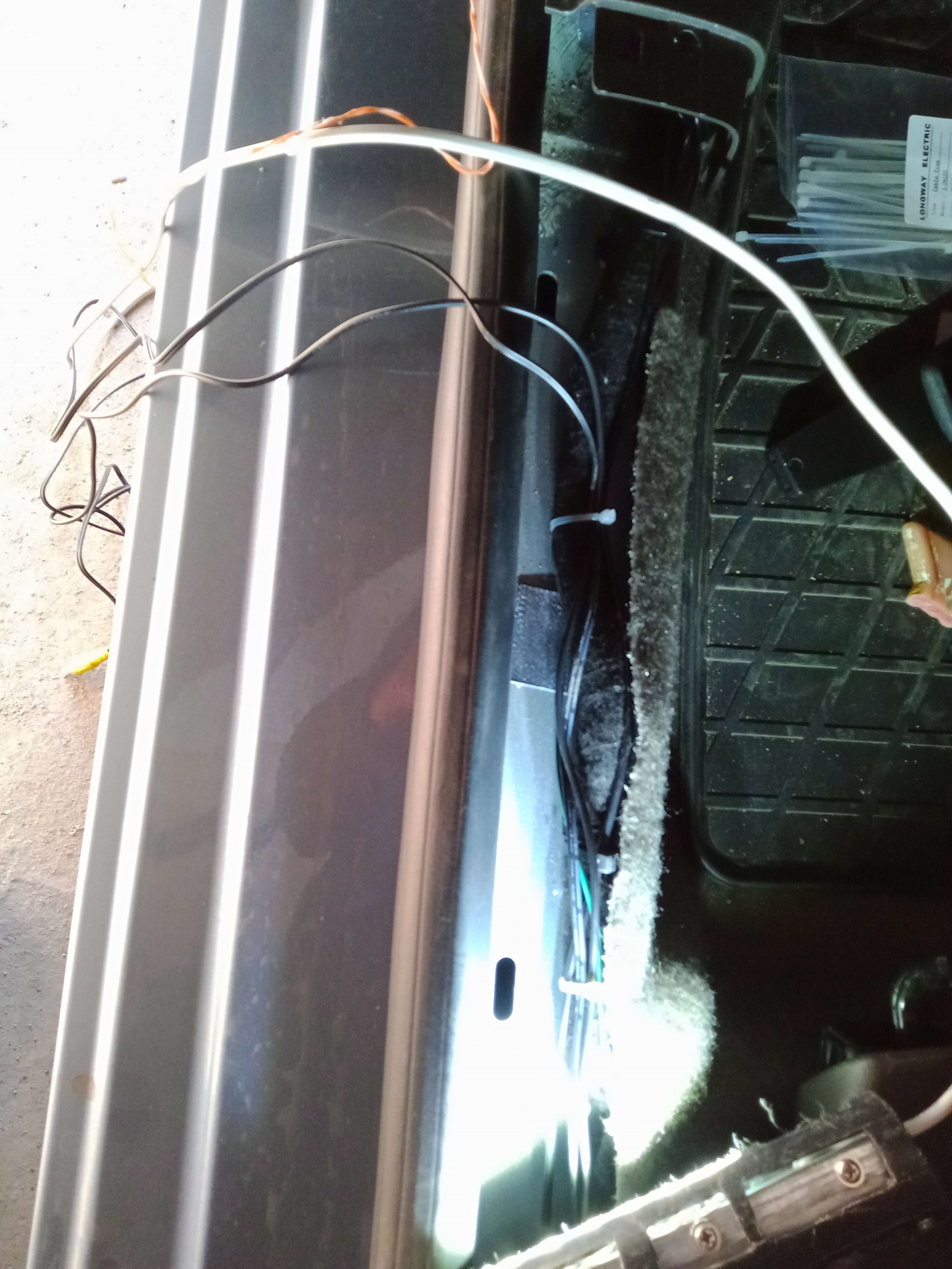 В отличие от коллег по ссылкам выше, которые тянули провода к магнитолам, моя трасса прокладки была длиннее. Пришлось снять накладку от порога до торпедо, левую заглушку торпедо (для этого надо частично снять уплотнитель двери) и накладку передней стойки.