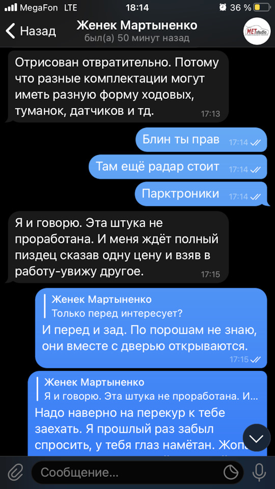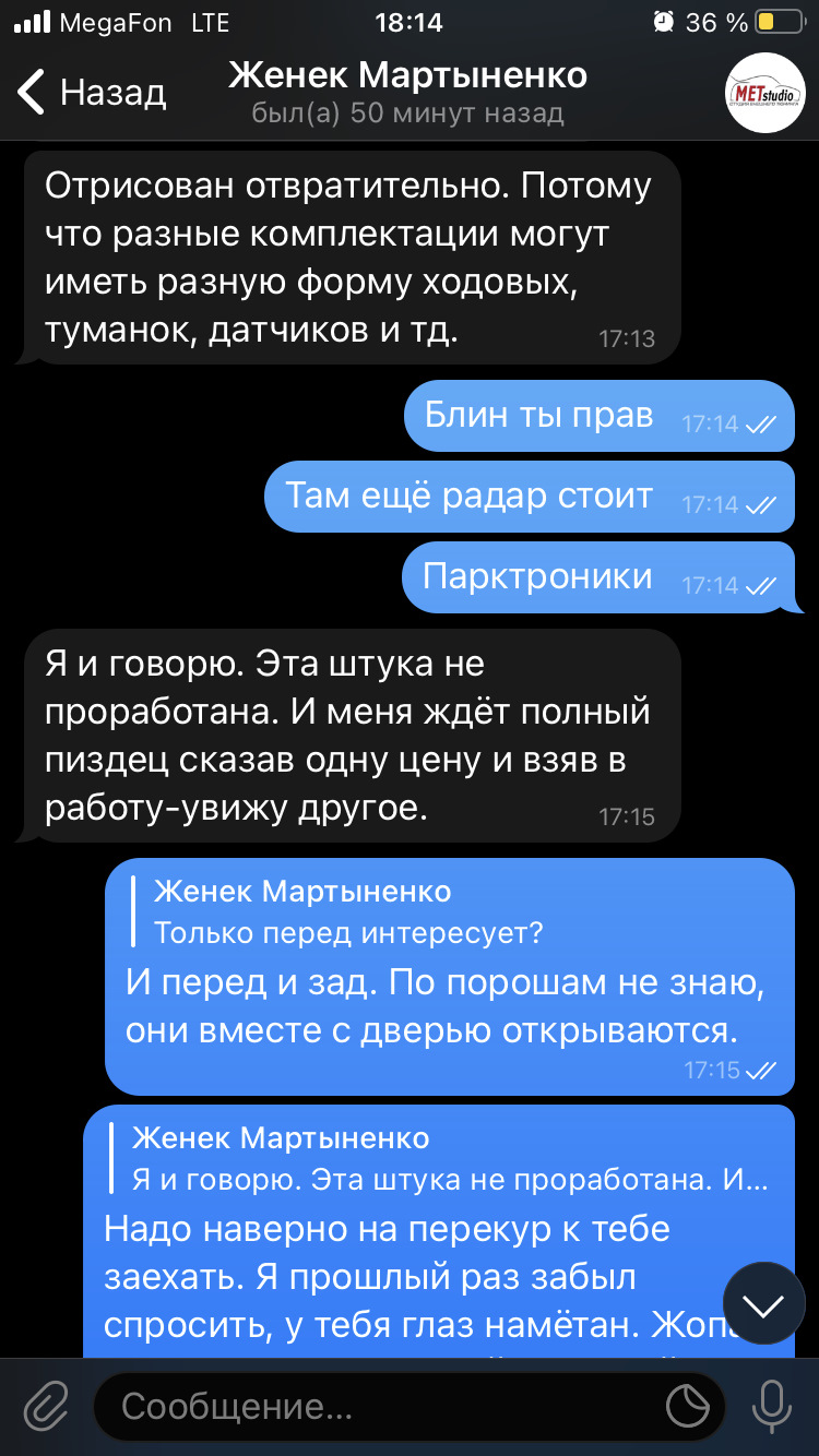 P.P.S. Жаль конечно. А по поводу обвесов у меня близкий друг занимается изготовлением бамперов карбоновых элементов и т.д. Если бы нам найти 20-30 желающих и одного, кто готов предоставить авто, то можно сделать такие бампера. Мне они самому нравятся, но машину не могу оставить. Чтобы все было идеально надо машину недели на 3 ставить к нему, чтобы все зазоры были идеальны. Met studio называется его контора. НЕ РЕКЛАМА