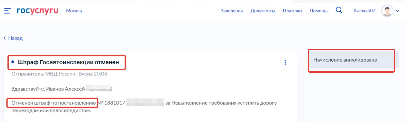 И вот, спустя 4 месяца с момента "нарушения" приходит ответ на госуслуги. Штраф отменен, начисление аннулировано.