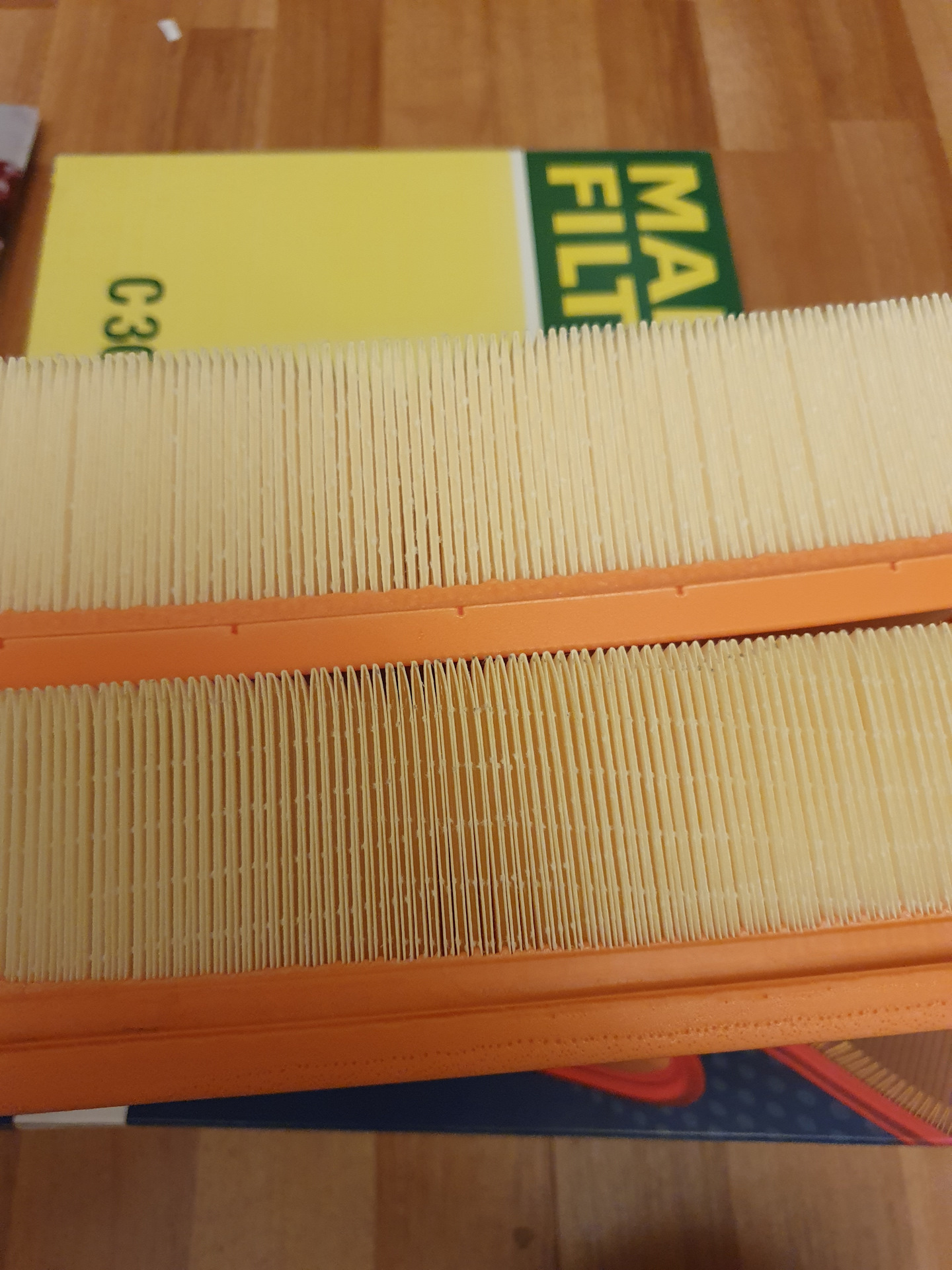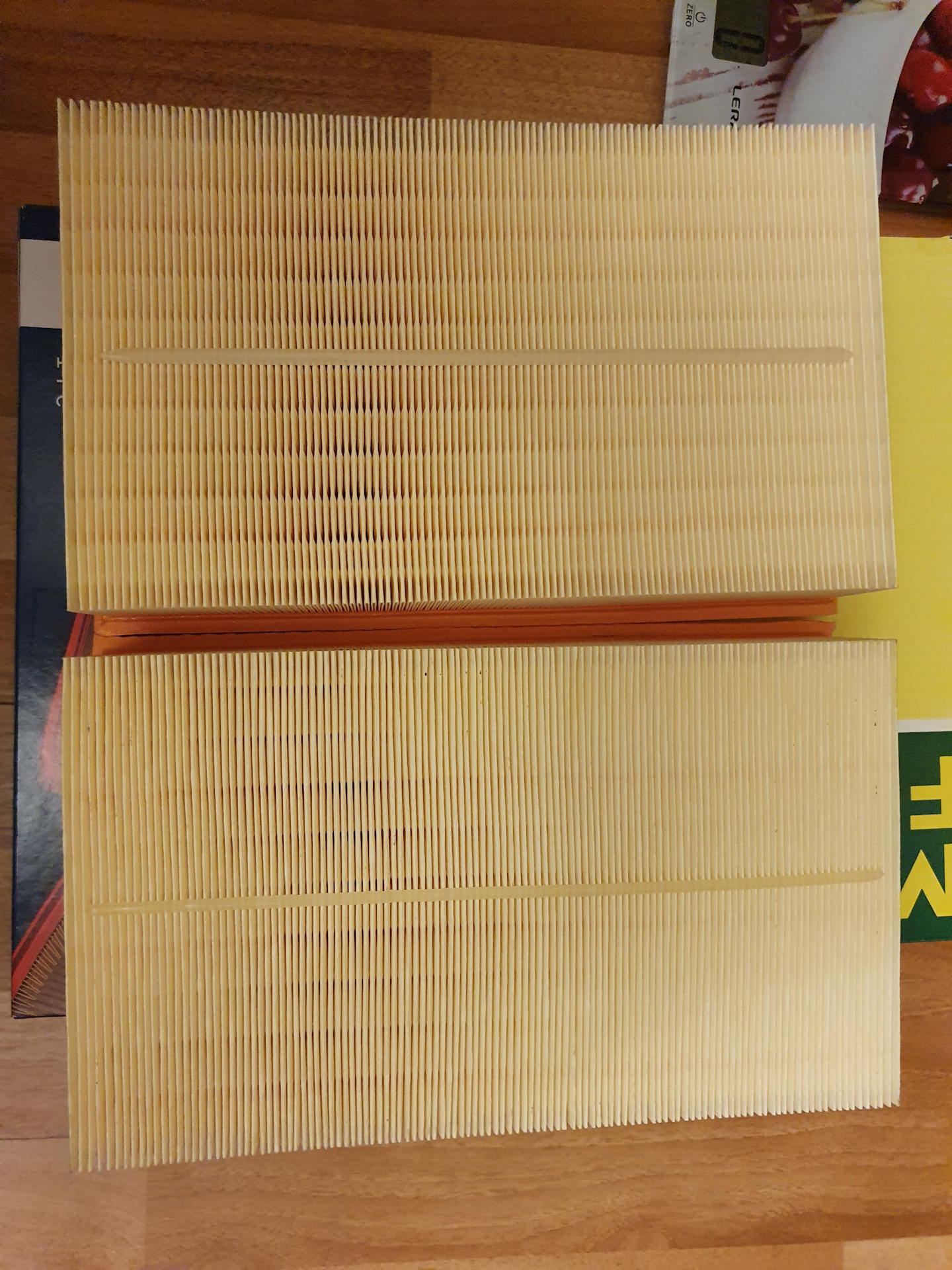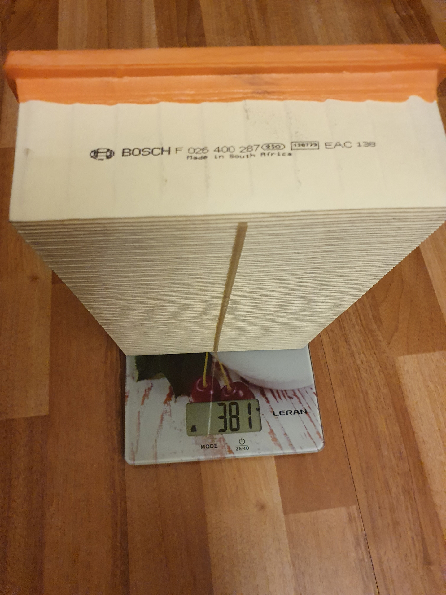 Фильтр воздушный Bosch (F026400287) на 140р дешевле где-то на 10 ламелей больше и вес его 381г. Полоска клея держит больше "бумаги" хотя это не принципиально. Фильтрующий элемент на вид одинаковый как по цвету так и по толщине, но у Боша его больше.