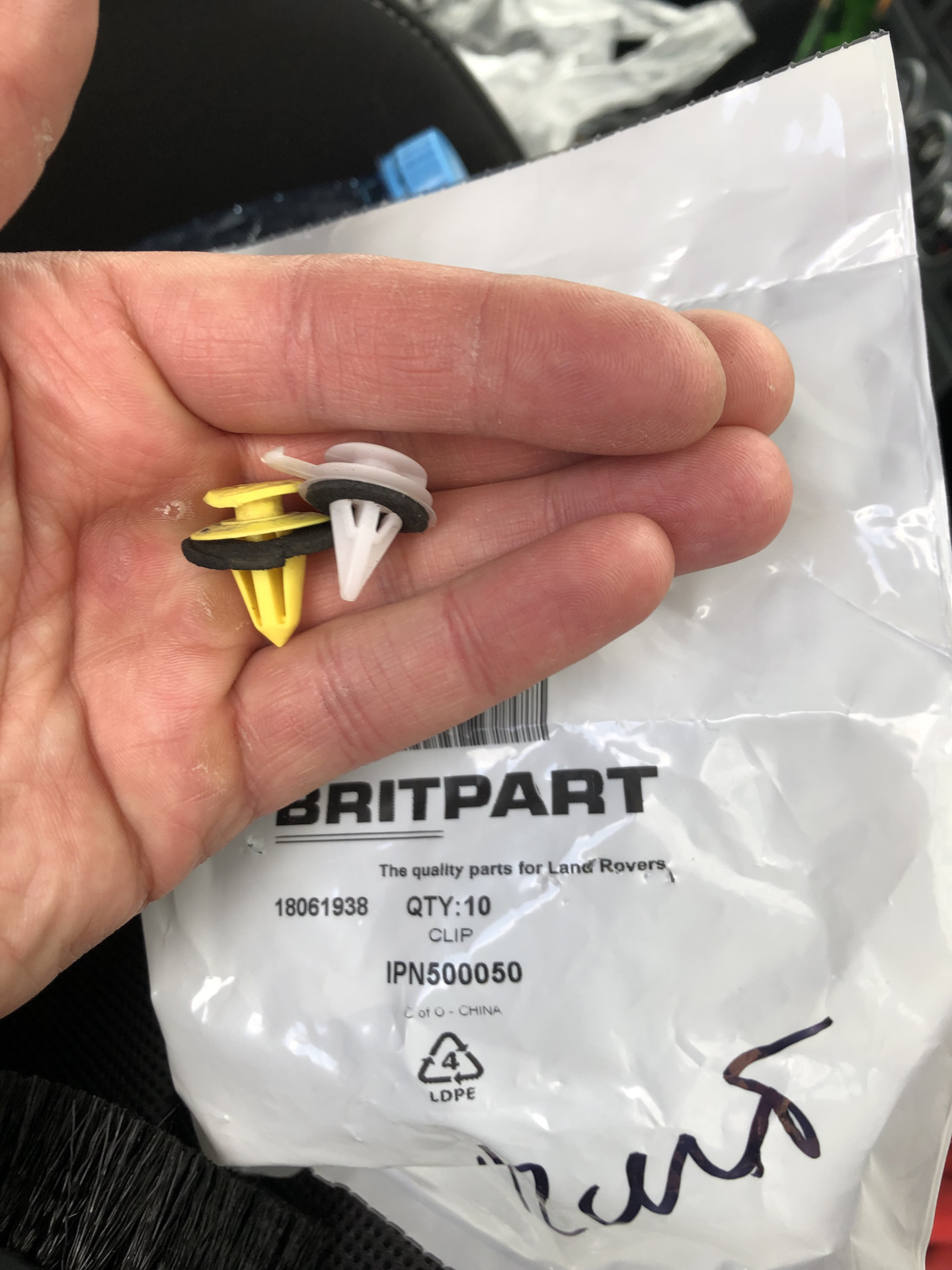 Решено было купить клипсы начал искать заехал в авто магазин, подходящих не нашёл, и на просторах инета в схемах нашёл номера, оригинал стоил примерно 100р. Аналог Britpart в два раза дешевле, подумав клипсы и с Китая ходят был опыт, заказал их одна клипса вставляется со стороны двери пришли, соответственно оригиналу, внутренние в молдинге пришли другие, стояли желтые ( потом увидел, что они с Али), а пришли белые!