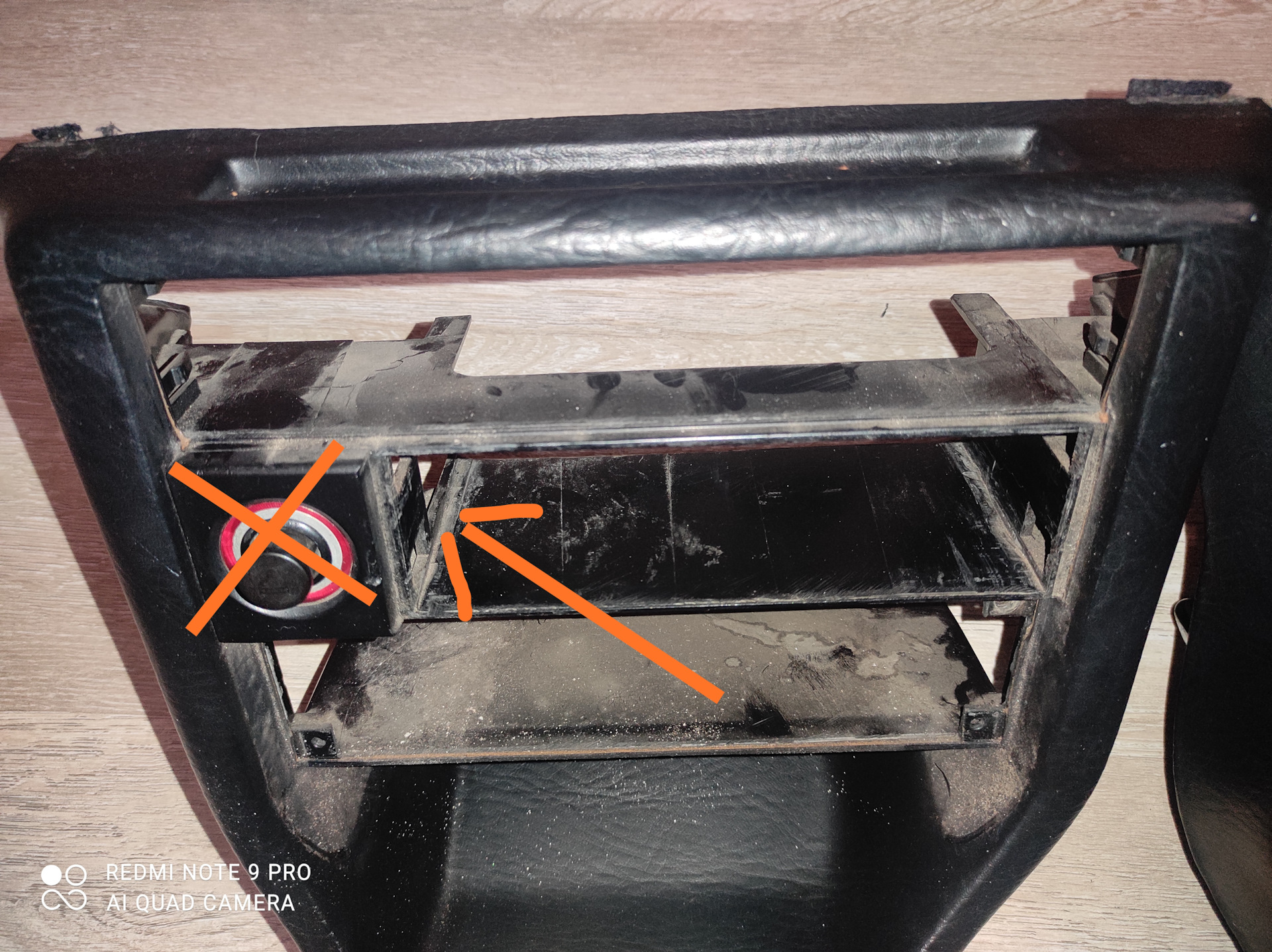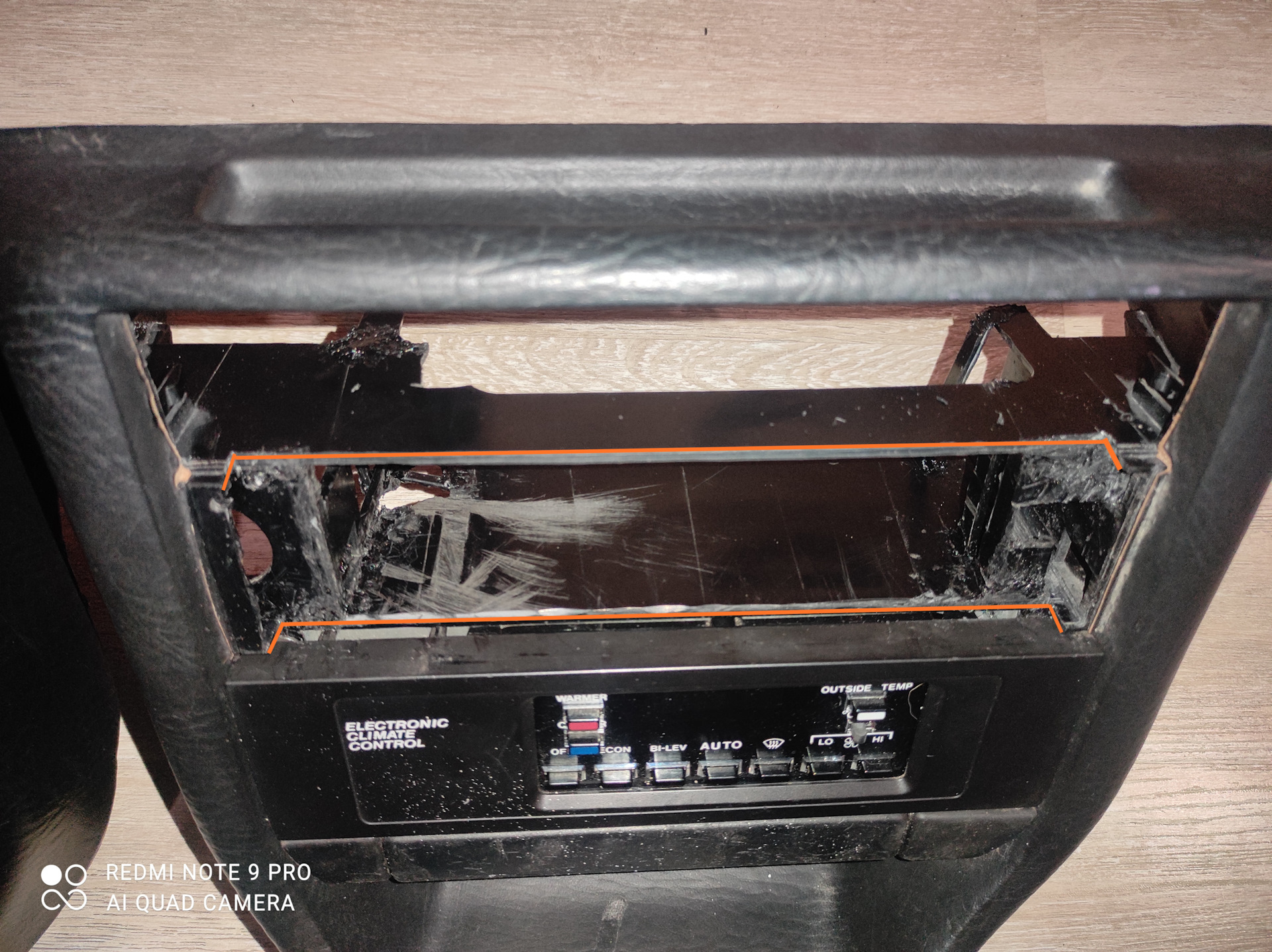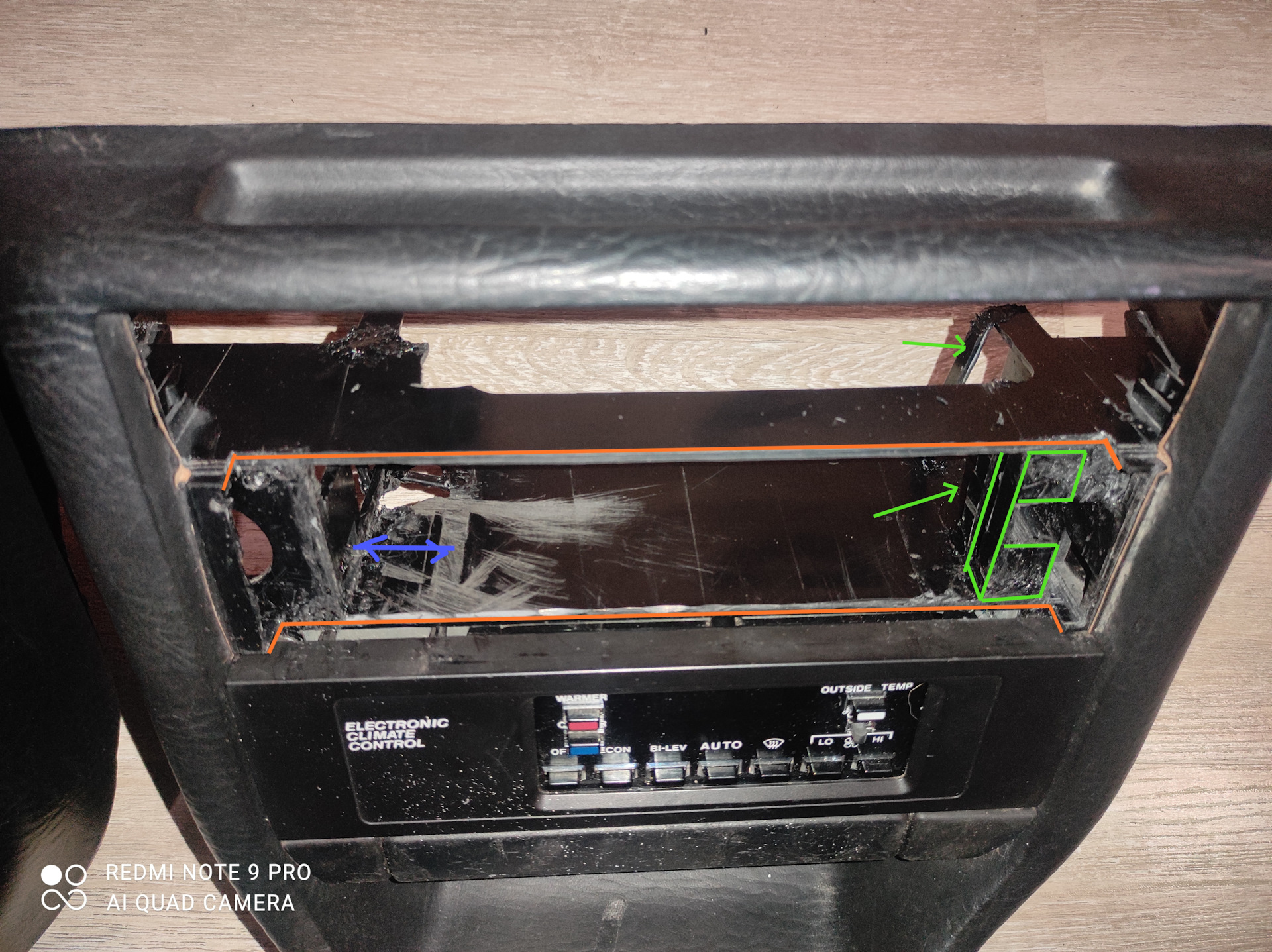 Поэтому срезаем лишнее(отметил красными линиями), чтобы углубить посадку магнитолы