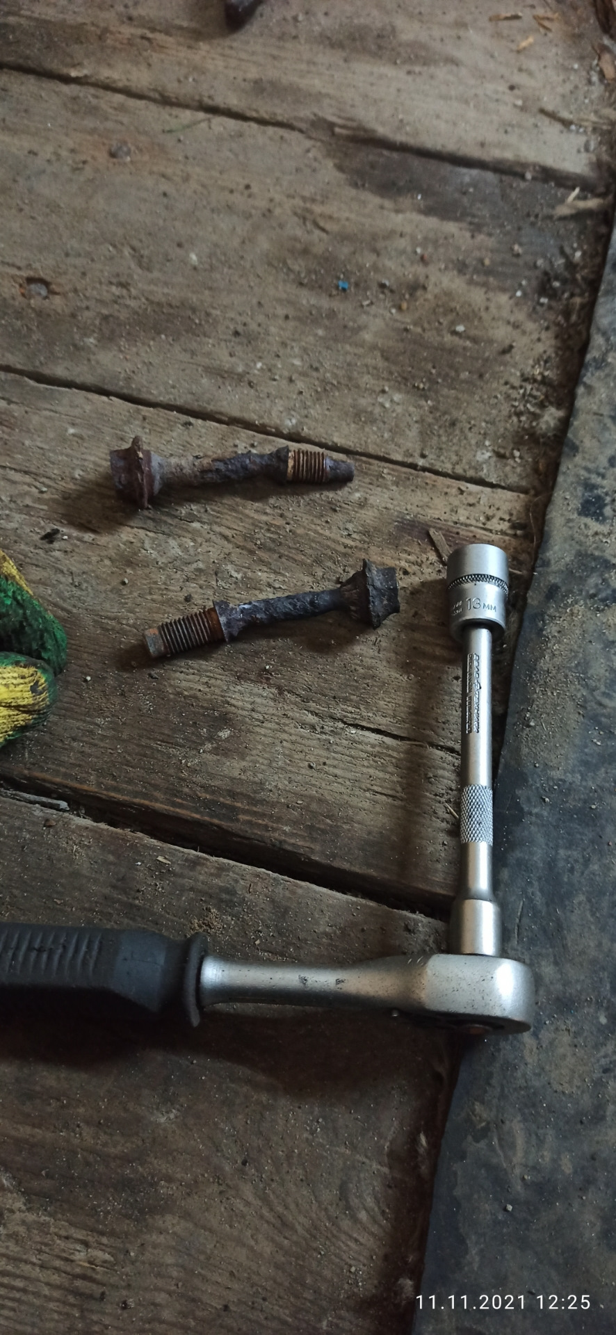 По инструменту пригодились шестигранная головка на 13, улинитель и вороток, молоток и зубило. Один болт который вкручивается на сквозную со скрипом открутился.