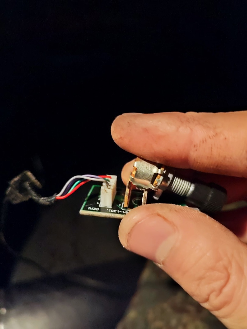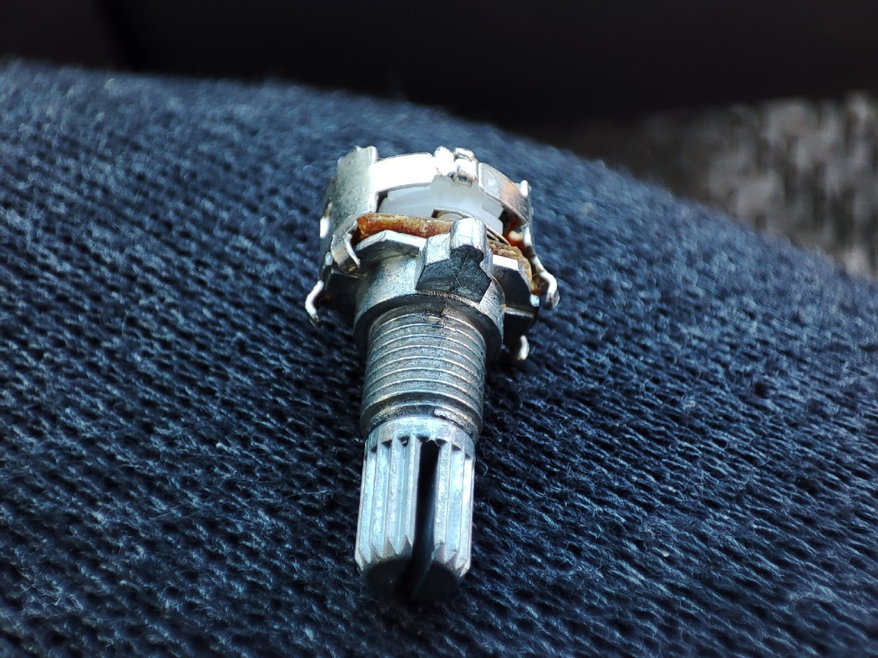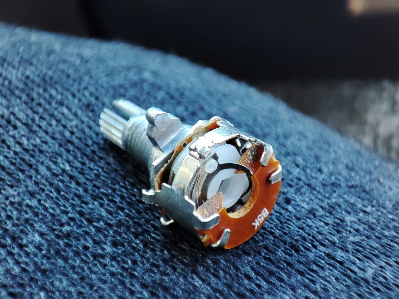 Разобрав блок с регулятором громкости сабвуфера, увидел потенциометр B5K. Я пытался его аккуратно выпаять, он обломился.