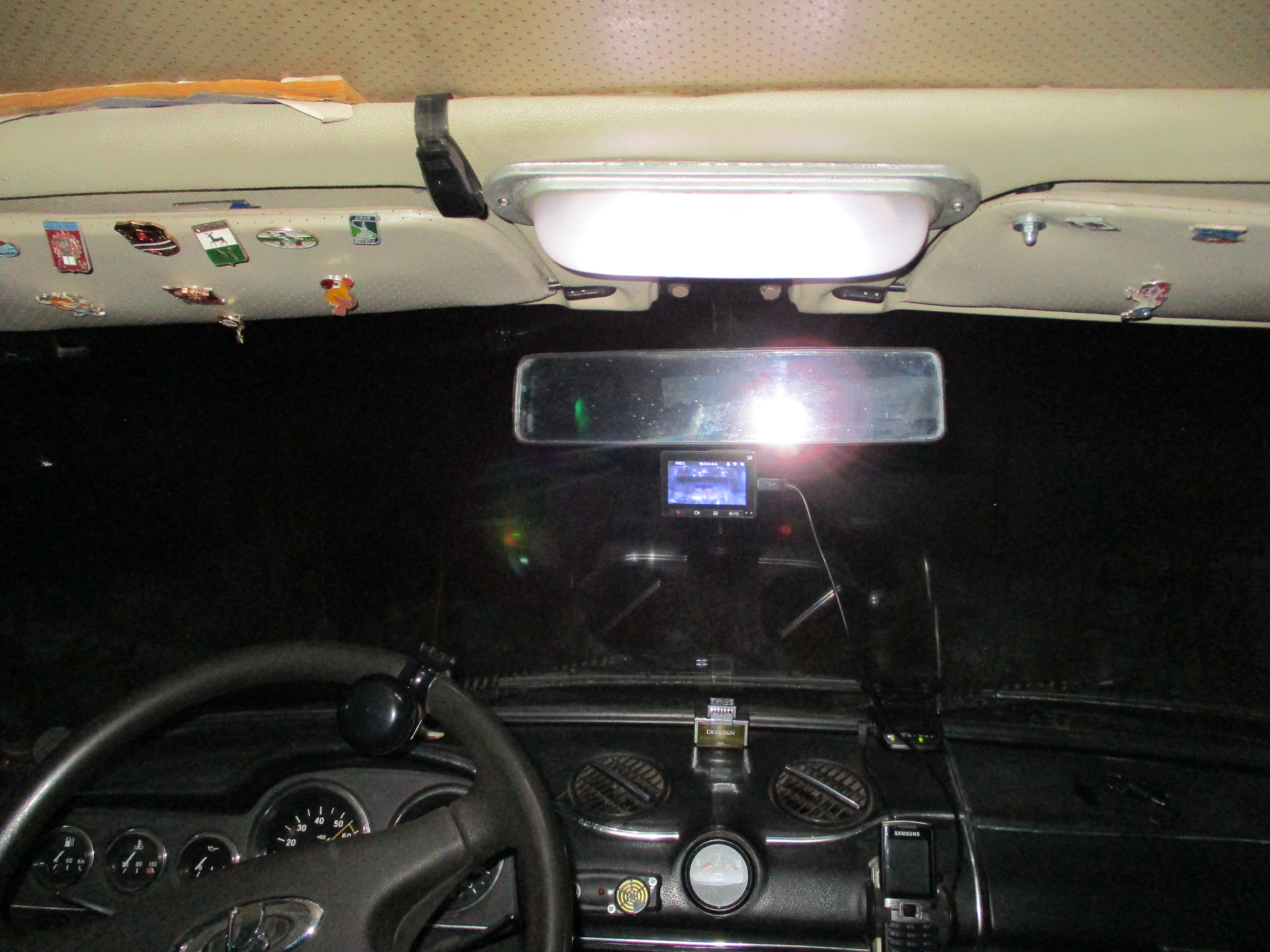Всем жигулистам, владельцам классических автомобилей известна одна досадная конструкторская недоработка — это никакое освещение салона или его полное отсутствие. Но наш народ на выдумку горазд и ещё во славное советское прошлое был найден выход из этого положения, а именно установка в салоне над зеркалом фонаря от освещения салона пассажирского автобуса. Была только одна проблема, как заполучить этот самый фонарь в личное пользование, ибо магазины тогда такими запчастями не торговали, а на пассажирских автопредприятиях был строгий учёт. Правдами и неправдами такие фонари всё же добывались, что добавляло тонны ЧСВ счастливым обладателям. Так же такие фонари очень активно устанавливали в патрульные Жигули милиции, особенно ГАИ. Мне лично такой фонарь достался со списанной патрульной семёрки ГАИ времён СССР.
