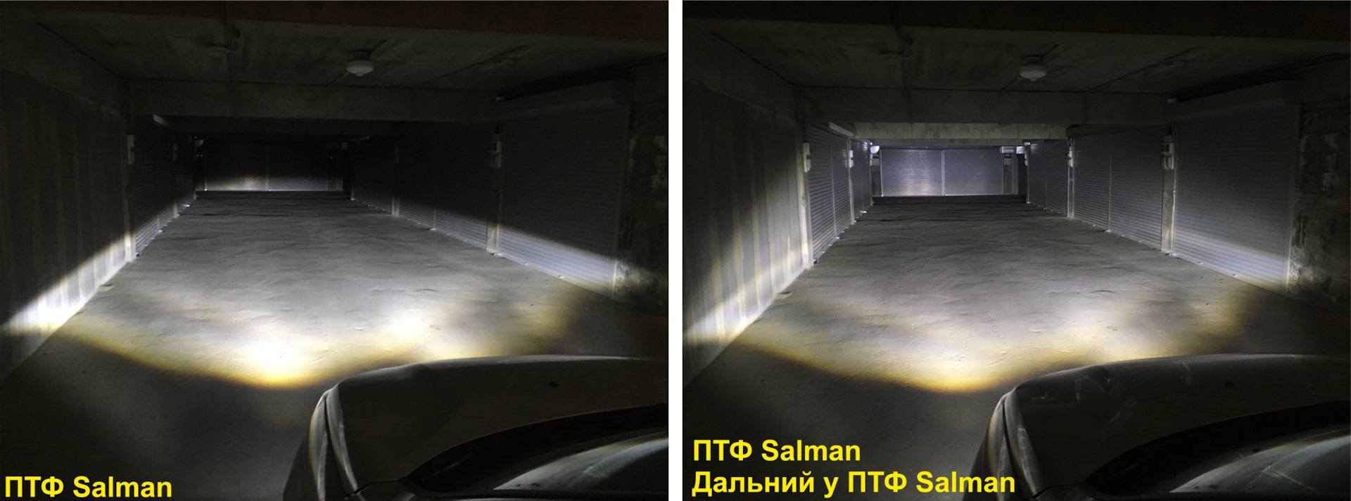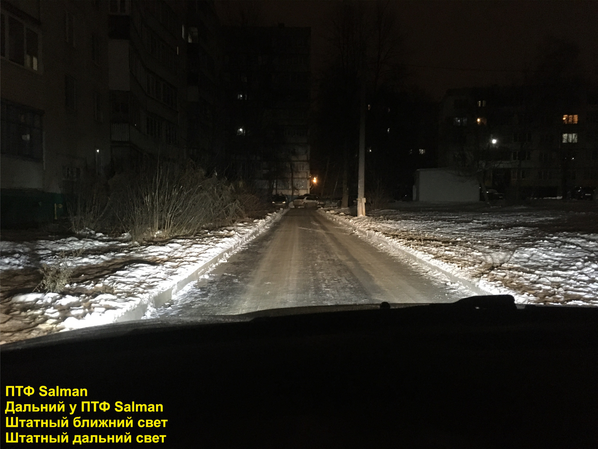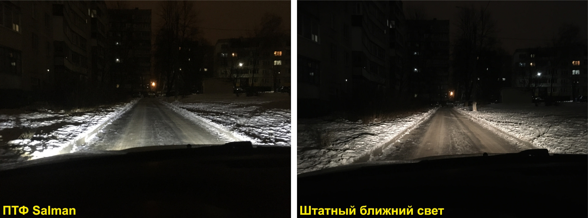 Глазами встречного транспорта. Для сравнения добавил фото со штатными ПТФ Valeo и лампой H16 (мощностью 19 Вт).