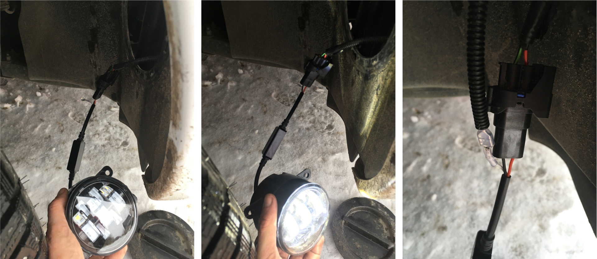 — Извлекаем противотуманки через отверстие в подкрылке;
