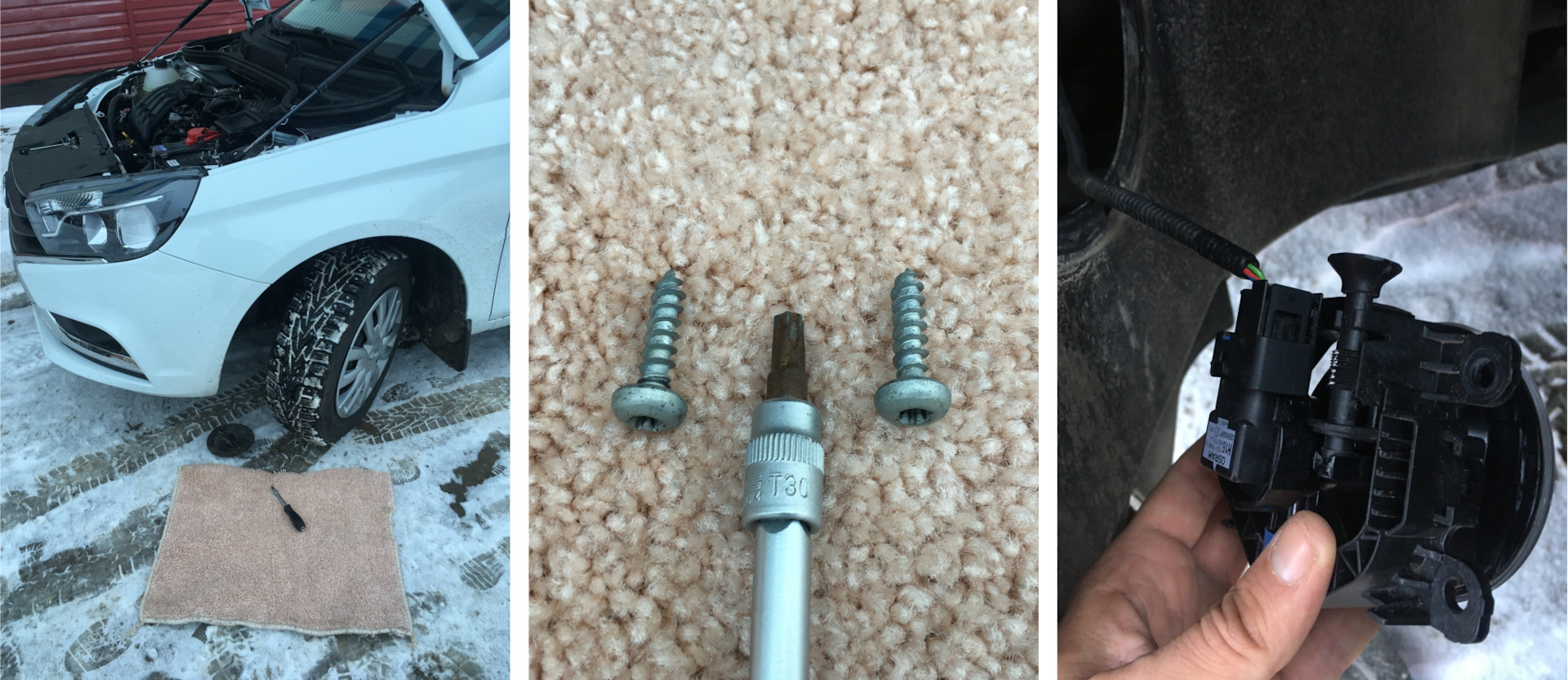 — Прикручиваем противотуманку штатными саморезами.