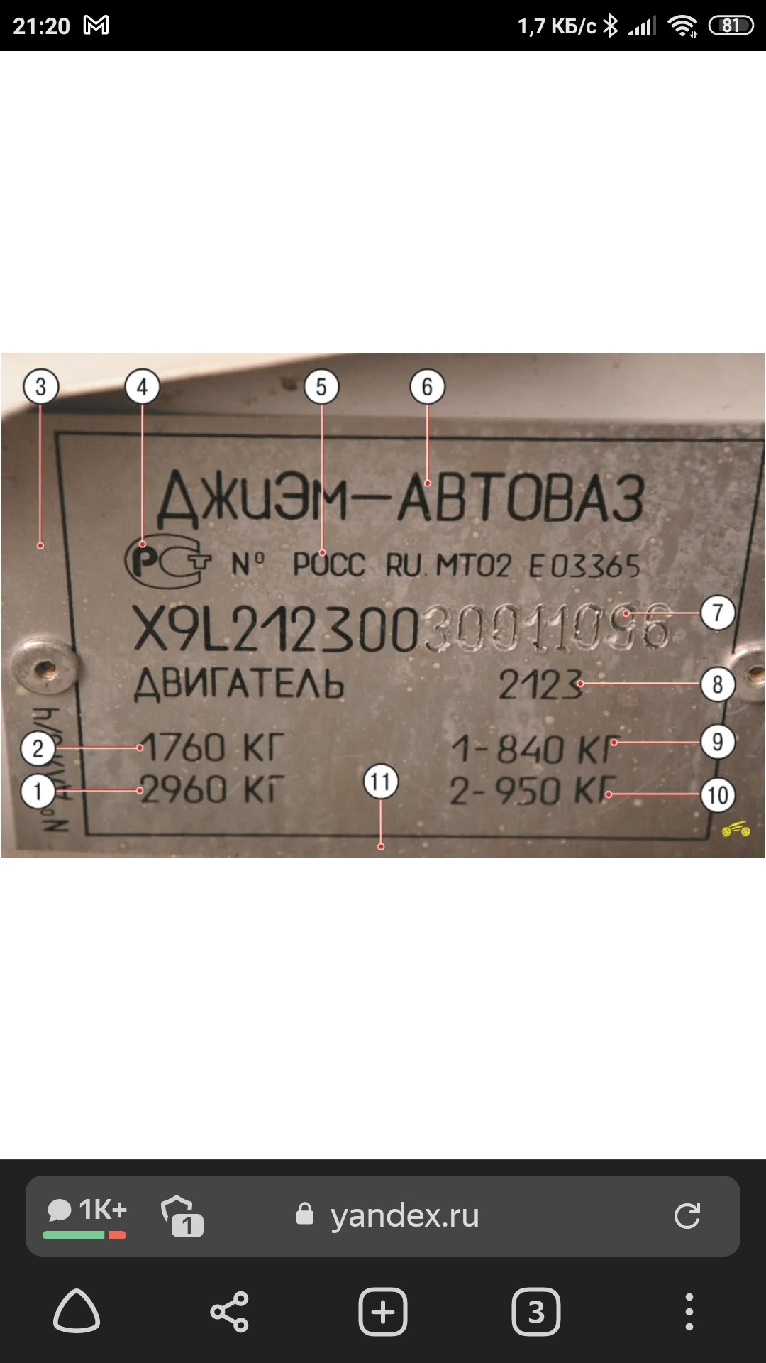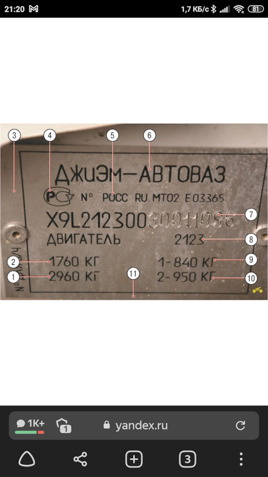 1 – допустимая масса автомобиля с прицепом; 2 – полная допустимая масса автомобиля; 3 – поле, на котором может быть указан номер для заказа запчастей; 4 – знак соответствия сертификации; 5 – код органа, выдавшего сертификат и номер одобрения транспортного средства; 6 – фирма изготовитель; 7 – идентификационный номер автомобиля; 8 – модель двигателя; 9 – допустимая нагрузка на переднюю ось; 10 – допустимая нагрузка на заднюю ось; 11 – поле, на котором могут быть указаны вариант исполнения и комплектация.