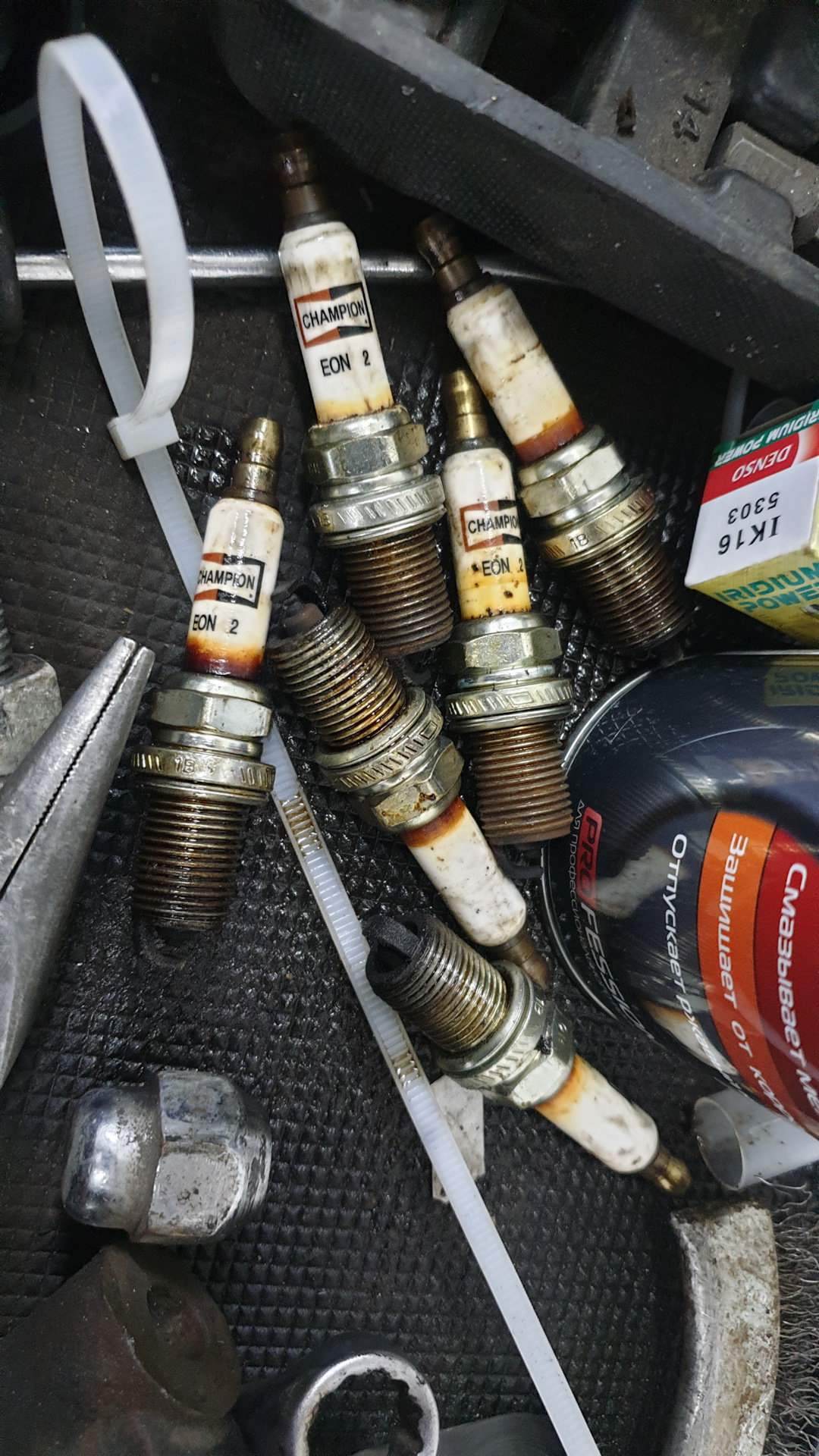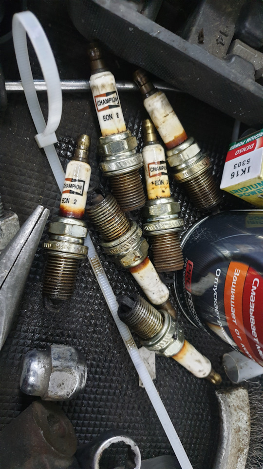 Свечи… Со стороны радиатора, опять было рыжее кольцо… Заменены на оригинальные, ожидал увидеть чемпионы, но внутри лежали NGK R, платина.