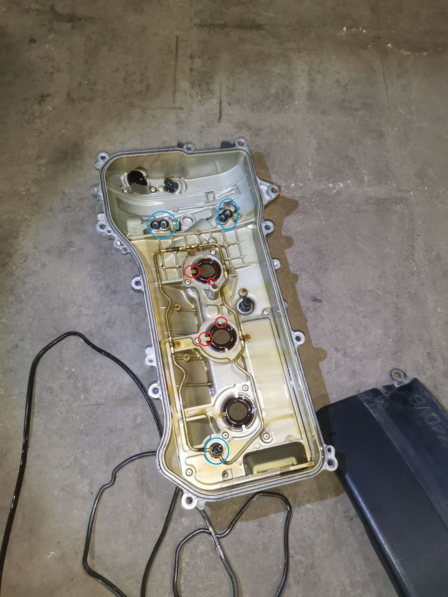 7) Обезжириваем по контуру места посадки крышек на бошках, желоба крышек, куда вставляются прокладки. Старые сальники свечных колодцев изымаем, предварительно отогнув усики (не забудьте вернуть их обратно), лично я ещё промазал места посадки тонким слоем "Дон Дила", так как оооочень долго пытался выковырять старые дубовые сальники и немного закоцал посадочные места в паре отверстий. Кстати, сальник 4 цилиндра уже сопливил, вовремя я всё это затеял) Чуть выше на фотке отметил, какие резиночки ещё меняются и какие усики отгибаются)