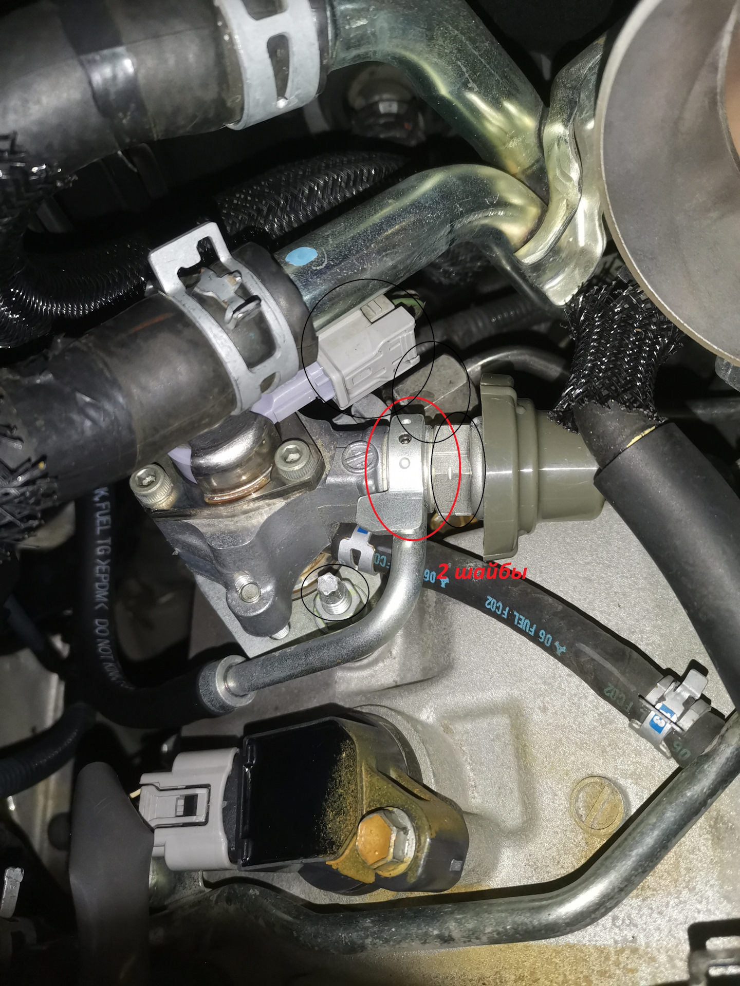 4) Снимаем ТНВД: Подстилаем под него максимально ветоши всякой, бенза выльется немного, но если коллектор горячий — опасно. 2 гайки на 22", фишка, гайки и шпильки выкручиваем (всё, что нужно снять, открутить — выделил черным, под шпильки в большом сата наборе есть головка, либо подберите её до ремонта). Выходит всё довольно-таки легко, из подводных камней — красным выделил 2 шайбы, вот одну я уронил в низ, а она не простая — сама круглая, а внутри — треугольная. Домкратил, снимал колесо, защиту, что бы дотянуться, ибо магнитом не достать — шайба аллюминиевая: