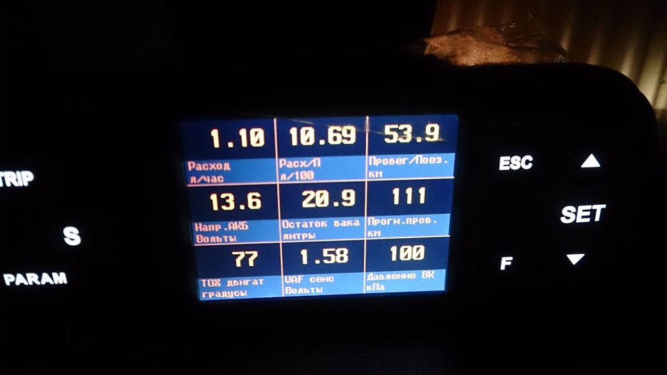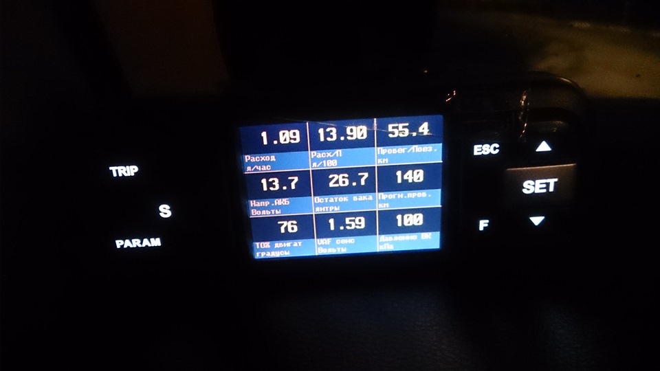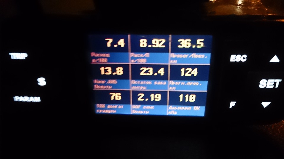 Началось все с того, что поставил себе мультитроникс. Ну чтобы наблюдать за температурой, давлением турбы и ради интереса за расходом. Поставил пока "на коленке", потому что разработчики мультика сделали так, что приклеив однажды его на стекло, снять с кронштейна его уже невозможно, только оторвать. Поэтому я прилепил временно, так сказать обкатать. Датчик топлива не подключал. Просто подключил в диагностическую колодку. Ничего не тарировал, поправки никакие не вводил, просто подключил из коробки, вывел интересующие меня показатели и настроил цветовую схему :) Бак расчетный. Т.е. всегда вручную ввожу, сколько залил литров. Расход, как ни странно, мультик показывал довольно точно. Я уже накрутил пару тыщщ км, и когда загорается лампочка заправки, он почти всегда показывает остаток примерно 10л. Если бы врал в какую-то сторону, то по остатку это бы уже определилось.