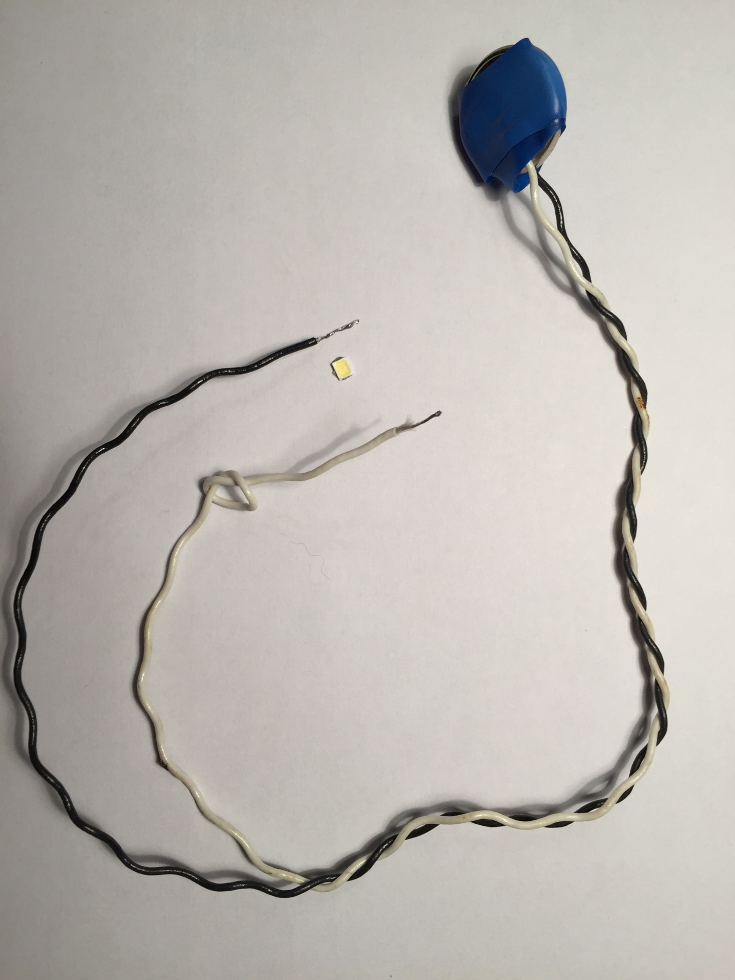 Из старой батарейки CR2032 на 3 вольта, которую я недавно заменил в ключе от авто и она ждала своего часа на утилизацию в ящике, я сделал вот такую приблуду для проверки диодов.
