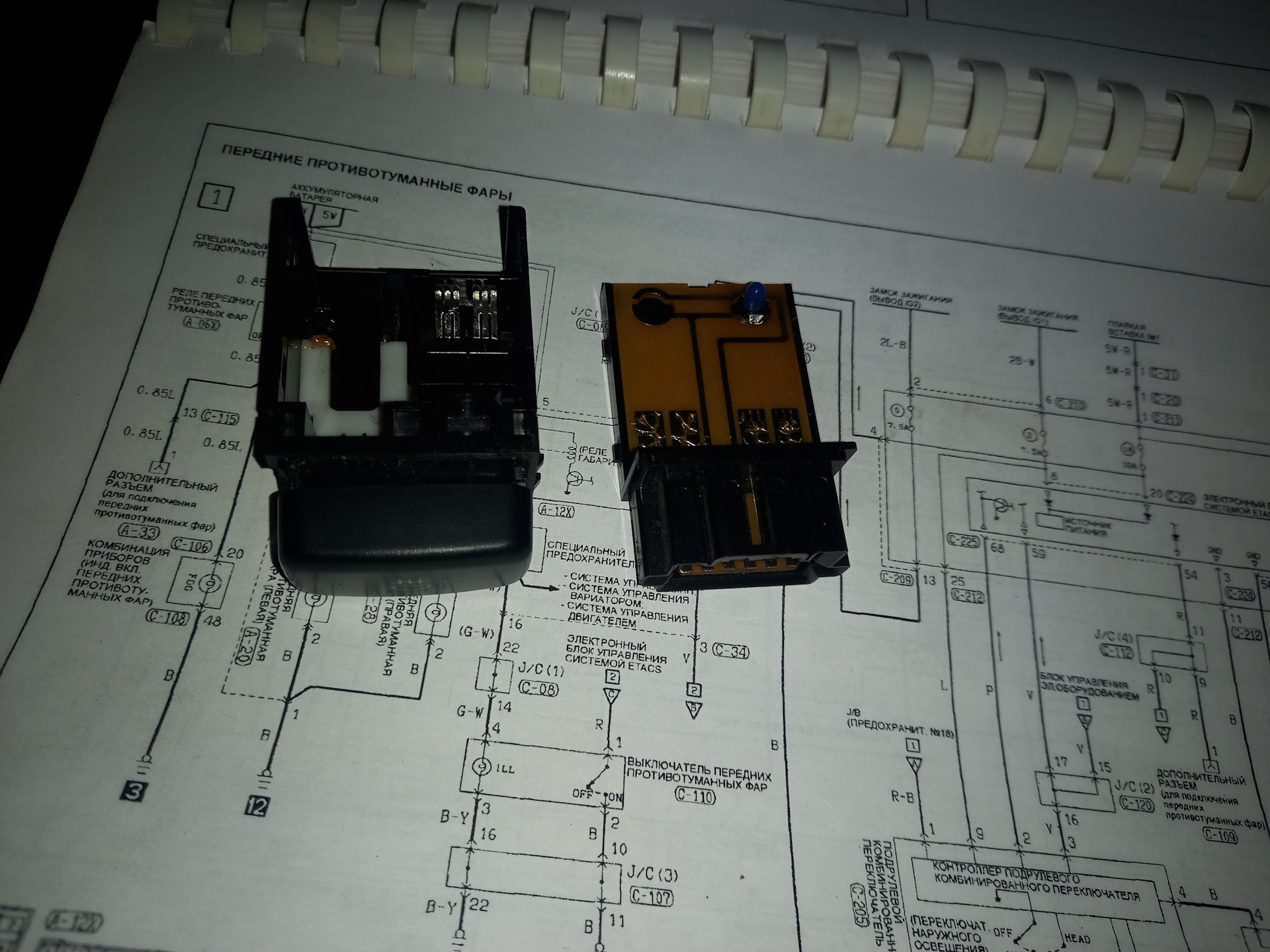 Потрошить 3 косы (салонную, в левом крыле и моторную) чтоб сделать по феншую уж очень лениво. Как быть? Ломал голову над этим вопросом с самого первого дня с момента установки лобаша. А тут как то потянулась рука нажать кнопку складывания зеркал и пальцы коснулись уже бесполезной кнопки задних туманок (передних с завода небыло, а задние не очень дружат с японским етаксом) и вот оно временное решение! От кнопки туманок уже заложен провод до самого подкапотного блока предов! Там уже все готово! Осталось только малость перепиновать, добавить пред помощнее и протянуть провод под жабо.