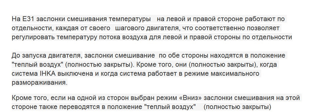когда занимался своим климатом, находил эту статью и читал дотошно, а также про Y-фактор мозгов, ну там вообще дебри bmw-donbass.com.ua/topic/…egulirovanie-temperatury/ На самом деле даже после полной ревизии печка продолжает е6ат мозги, справа дует холодным, хотя клапана новые (с алишки). Когда их откидывал, все равно дуло у пассажира холодным. Также моторчик сам по себе иногда включается когда зажигание включаю, ну и при вкл обдува лобача выключается печка, так должно быть?