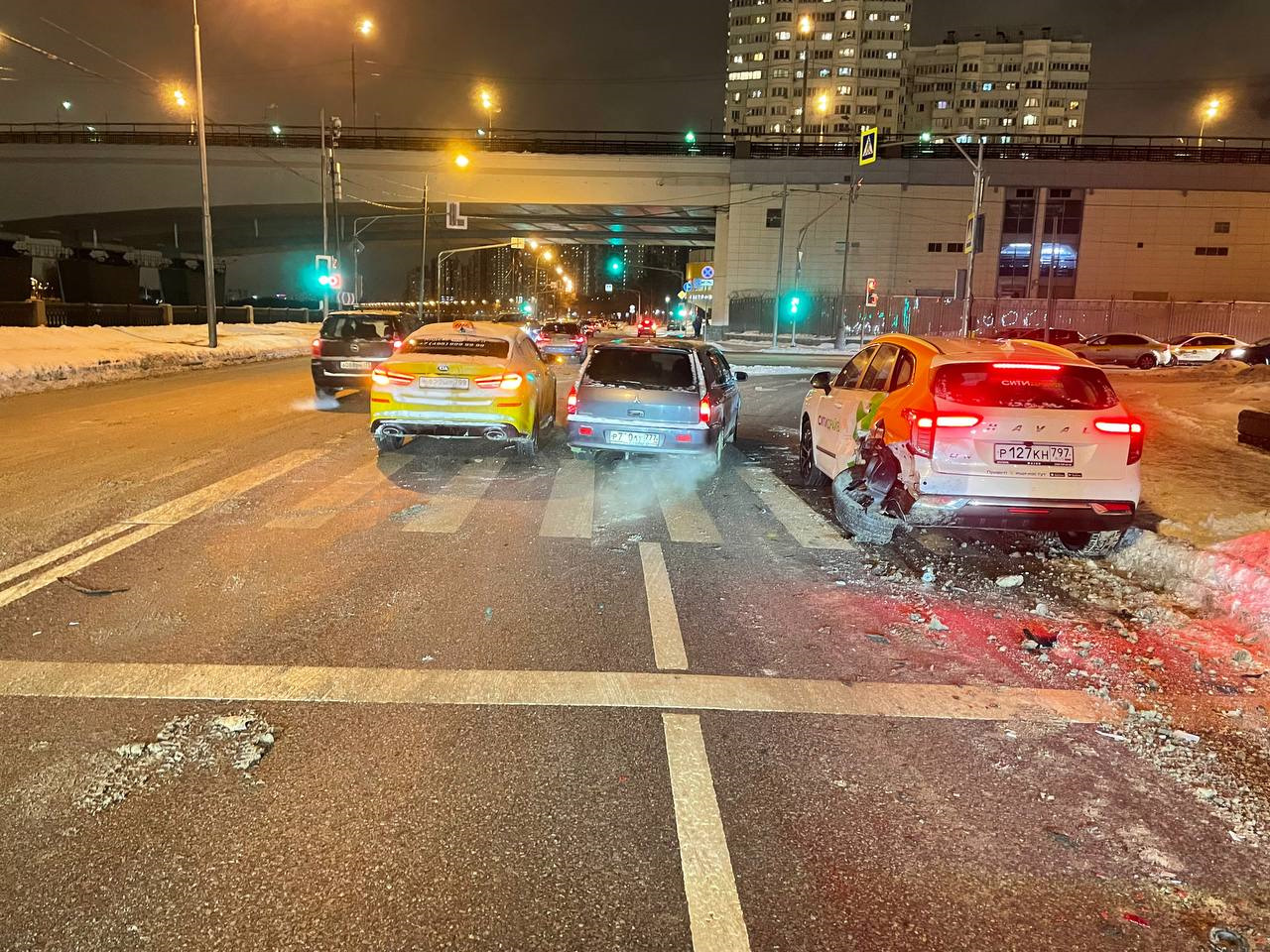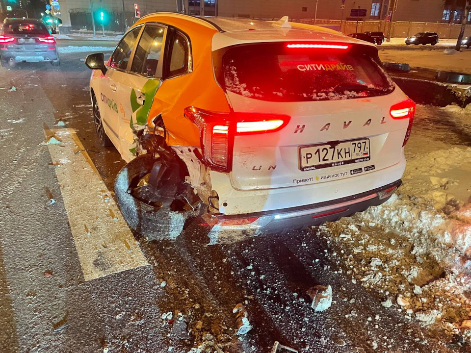 Привел этого чудика к остальным пострадавшим и начали смотреть последствия. В ДТП суммарно пострадали 4 ТС — его BMW F30 335i, моя BMW, каршеринг Haval и Kia Optima. У меня и у Оптимы были минимальные повреждения, поэтому водитель такси решил ретироваться в скором времени. В моем случае, меня догнал его отваливающийся сплиттер и ноздря, которые поцарапали мне низ бампера. Не очень круто, но жить можно. А вот Haval под списание, на него пришелся основной удар, машине оторвало заднее левое колесо, появился огромный залом на стойке и вся левая часть ушла вплоть до переднего левого крыла. Открывалась с трудом передняя дверь, все остальные зажало.