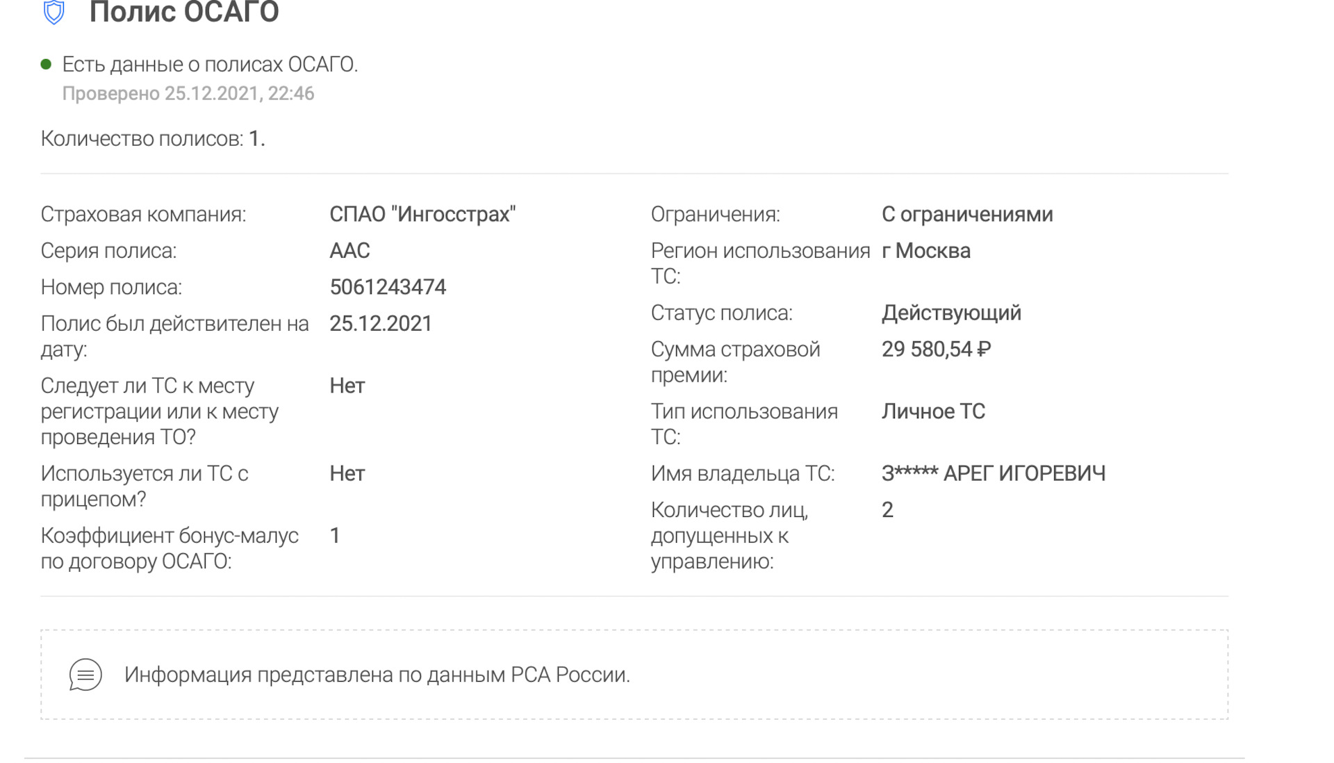 ФИО полное получилось выяснить при звонке в Ингосстрах. Я назвал лишь фамилию и имя, а менеджер уже случайно проговорился, что отчество у него Николаевич и да, он вписан в страховку так же, а сам полис действителен.