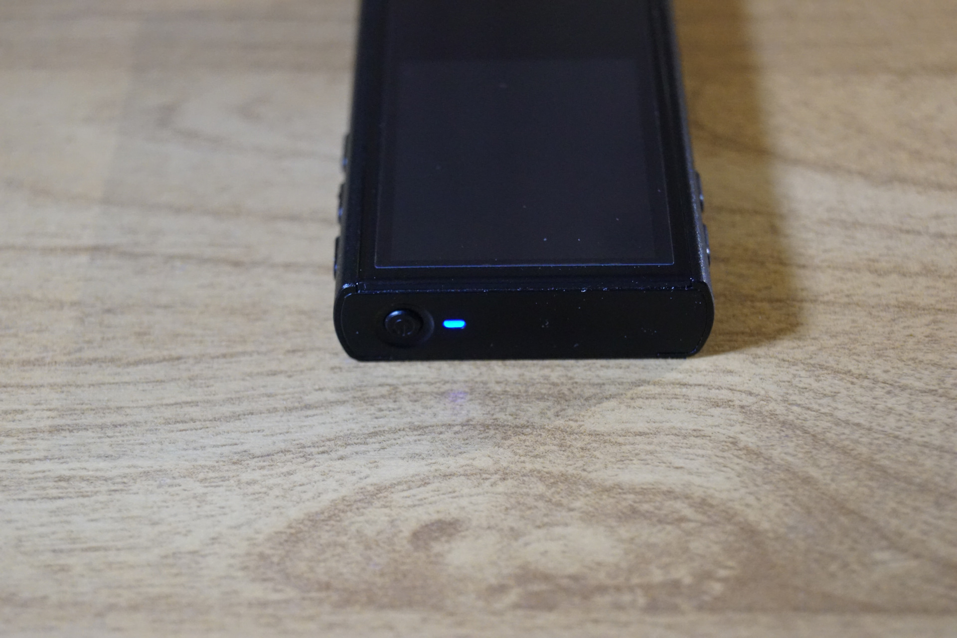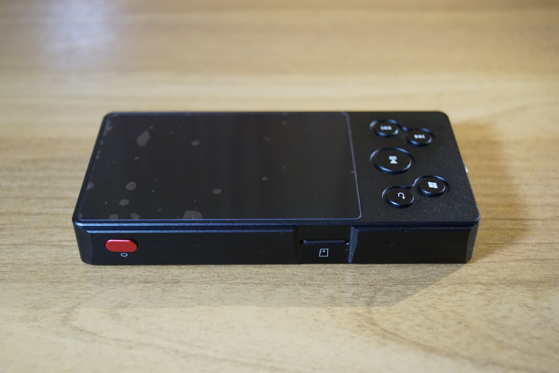 На лицевой панели управление воспроизведением и навигация по трекам и меню, клавиша возврата и вызов быстрых настроек. Над экраном слева индикатор состояния.