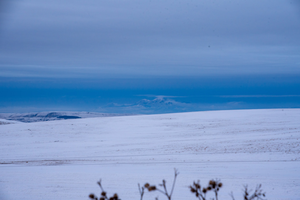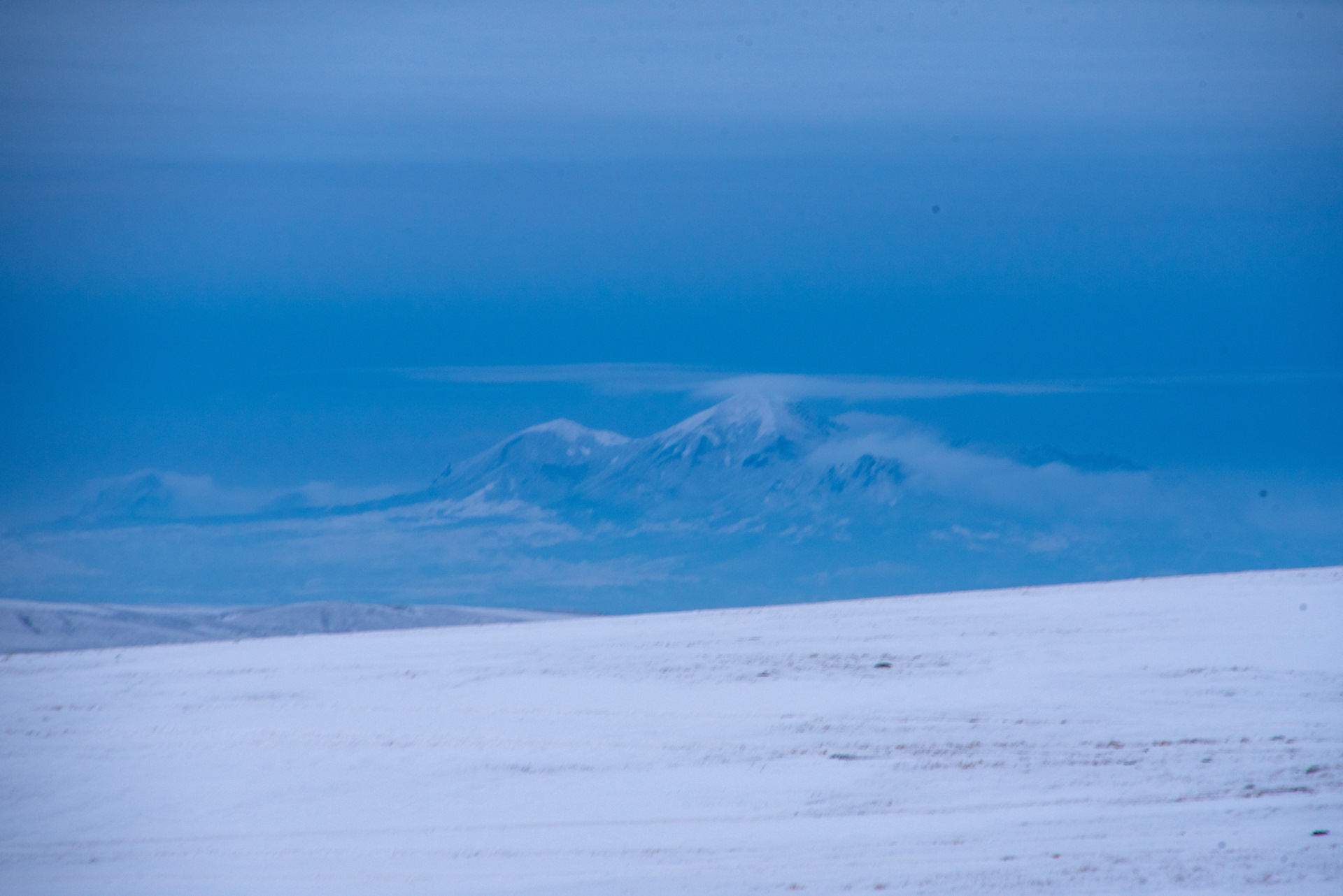 На обратному пути, когда туман чуть чуть рассеялся стали видны горы. И вот тут ждала нас засада. Увидев красивый вид на Бештау, решил остановиться у обочины (слегка заехав на неё). Но не тут-то было, на обочине находилась канава (вернее промоина) засыпанная снегом. Со стороны просто небольшой уклон, а на деле машина сразу же сползла в эту канаву. Видимо ветром нанесло туда снега и сравнялось всё.