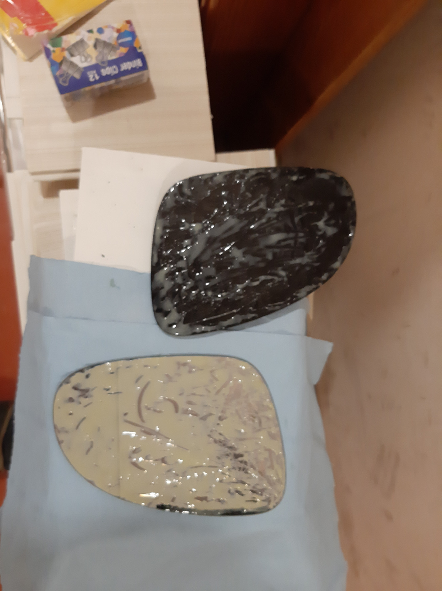 Тщательно прижимаем друг к другу. Зеркальный элемент закрываем бумагой чтобы не поцарапать. Фиксируем канцелярскими прищепками. Оставляем на 24 часа.