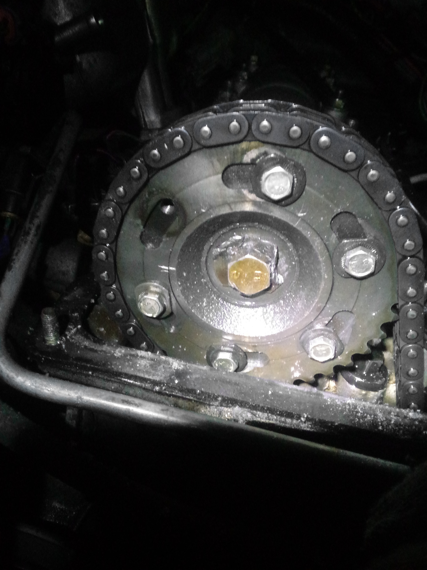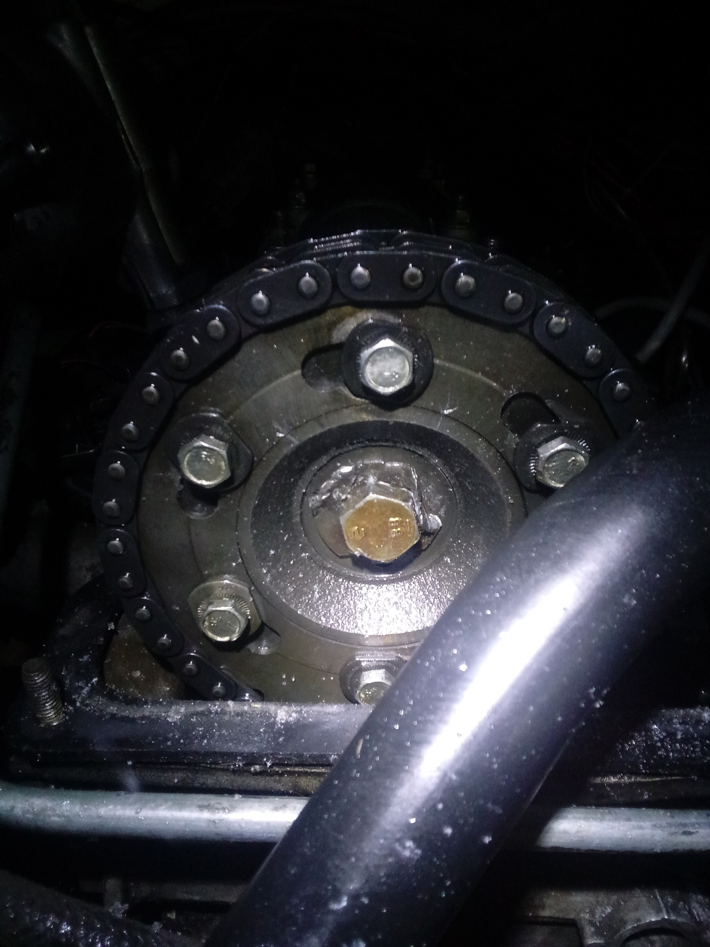 РВ повернул примерно на 1/3 зуба может чуть меньше. Затягивал РЗ от руки не сильно т.к. болты имеют прочность 5.8, один был порван. Благо тянул у самой головки и давил не сильно. В результате болт чуть чуть порвался но не разделился, благодаря чему я его смог выкрутить.