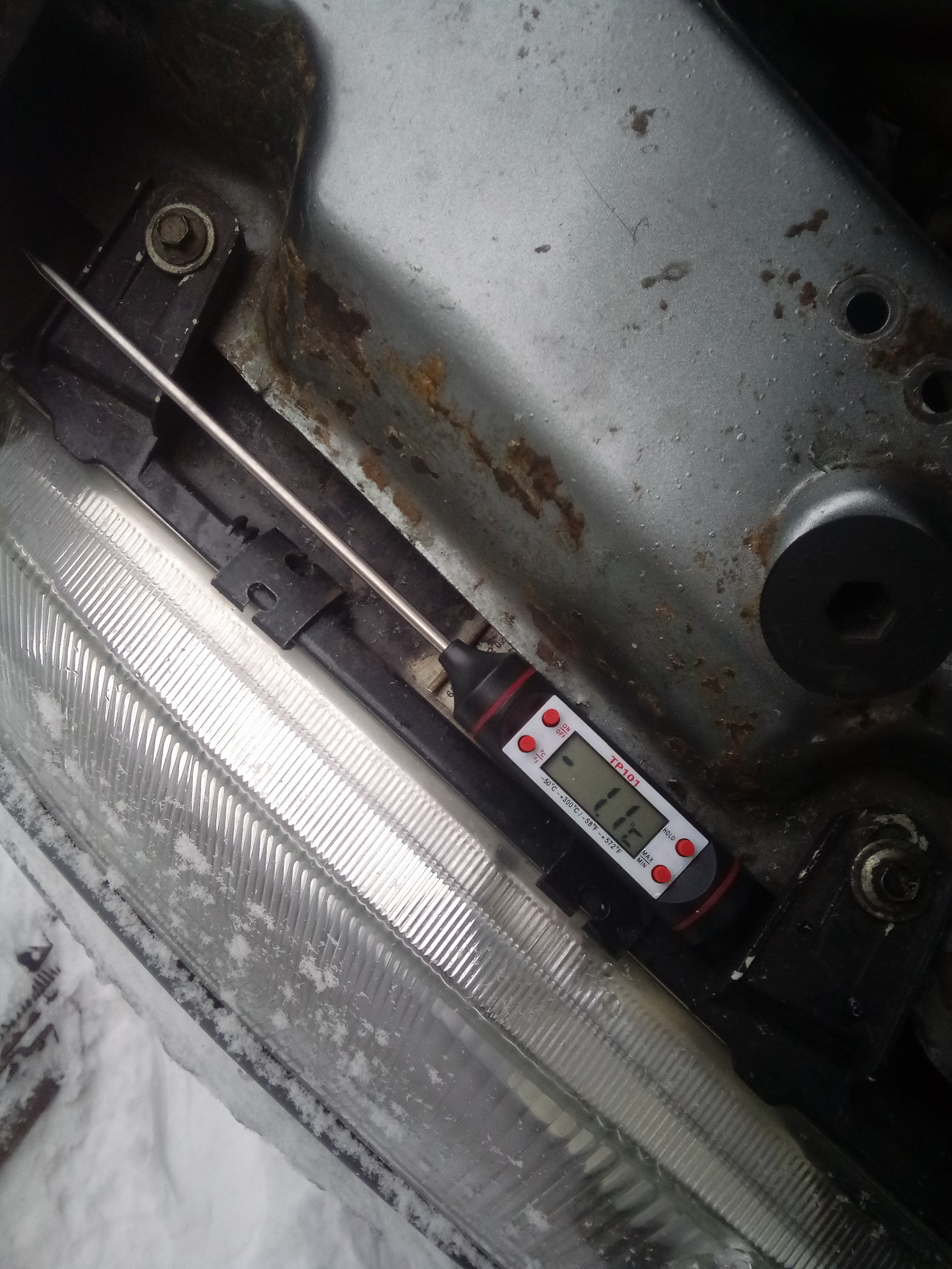 И так. Морозец у нас отпустил до -1. И я решил с утра, часеков та к в 12 сделать то что хотел ещё с наступления зимы — крутнуть разрезную шестерёнку. Ну и клапана поглядеть. Хотя они вроде не стучат, но всё же. Регулировку клапанов планировал контролировать индикатором а не щупом, для этого необходимо знать температуру двигателя. Для измерения я использовал "кухонный термометр"