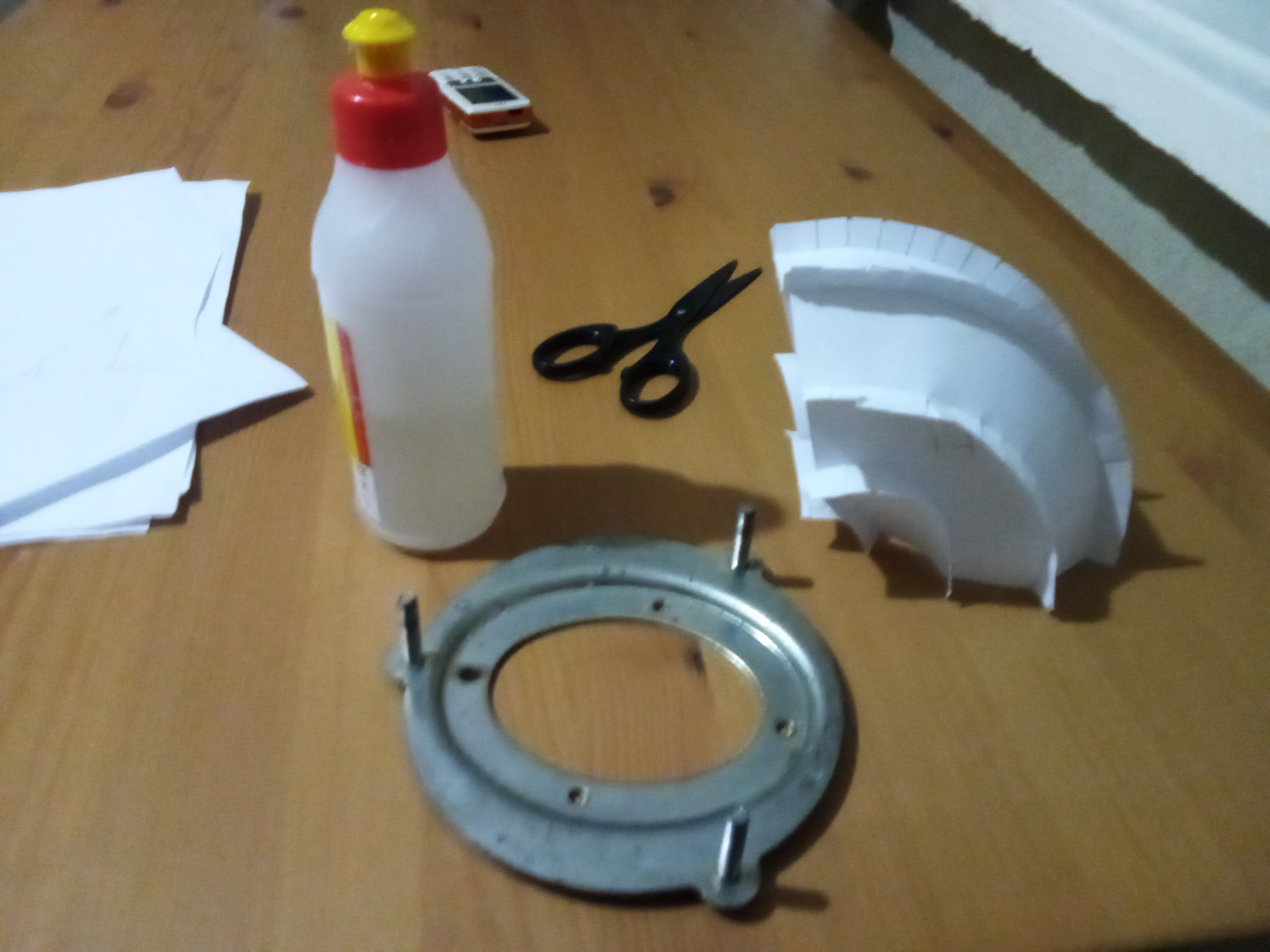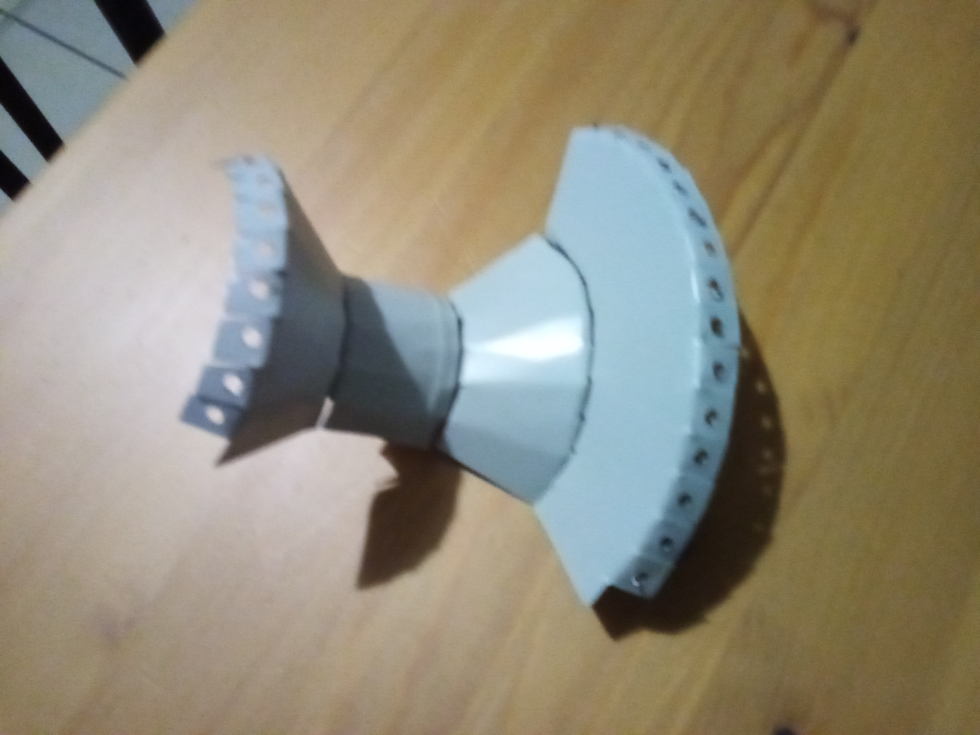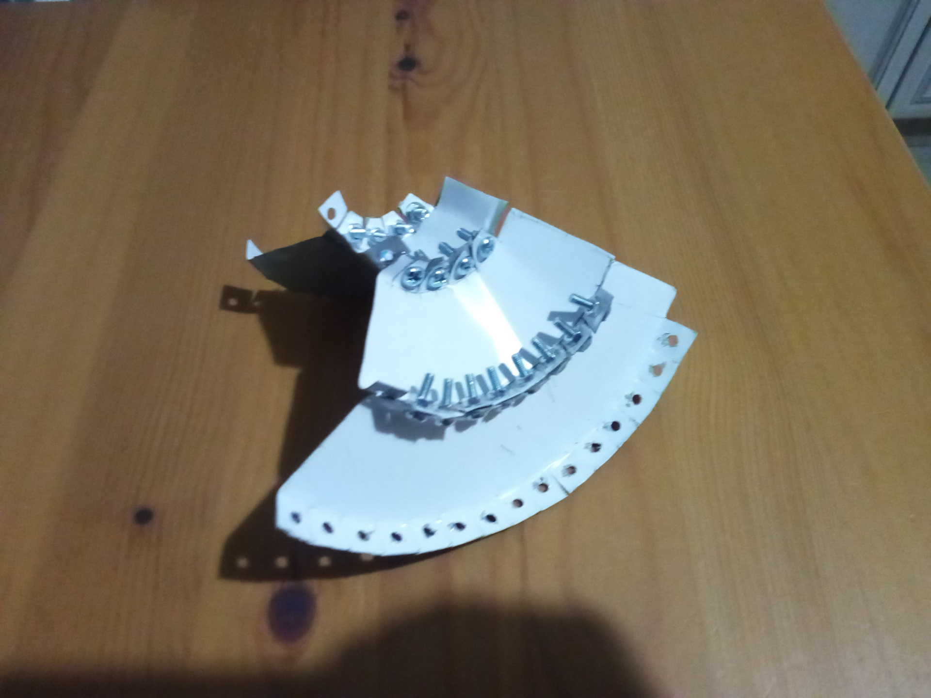 Стал делать в металле. Сами сегменты собираются на винты М3, в общей сложности ушло почти 100 винтов, шайб и гаек. В стык деталей для герметизации проложен двусторонний скотч. За счёт скотча и того, что листы металла толще бумаги, реальный диаметр получился больше расчетного, но не намного.