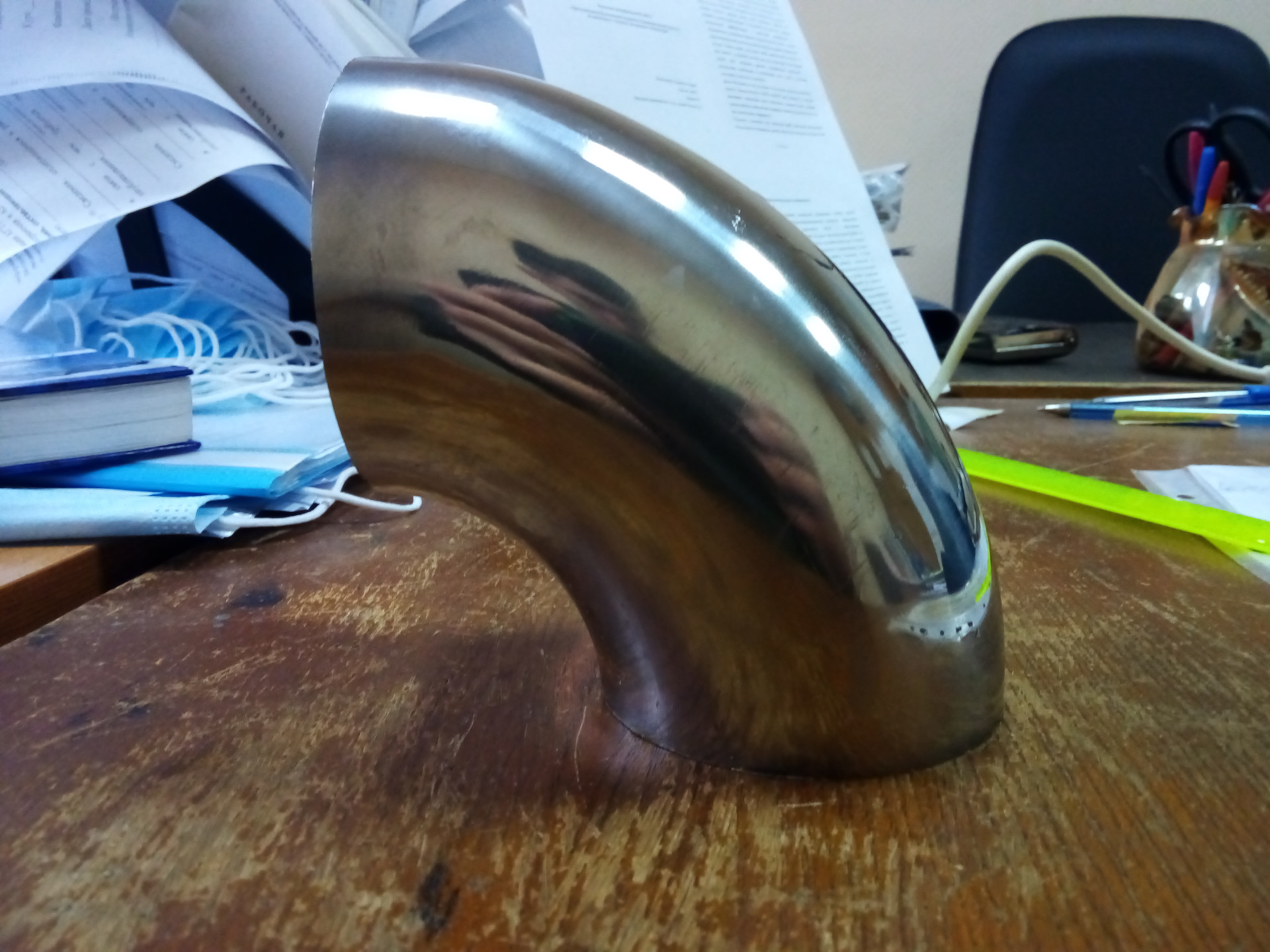 Подобрал я уголок трубы из нержавейки на 76мм, 90 градусов, толщина стенки 1,5мм. Думал, что один край согну в овал под карбюратор. Но не тут-то было! Тиски, молоток не помогли. Знал, что нержавейка крепче черных сплавов, но не думал, что настолько.