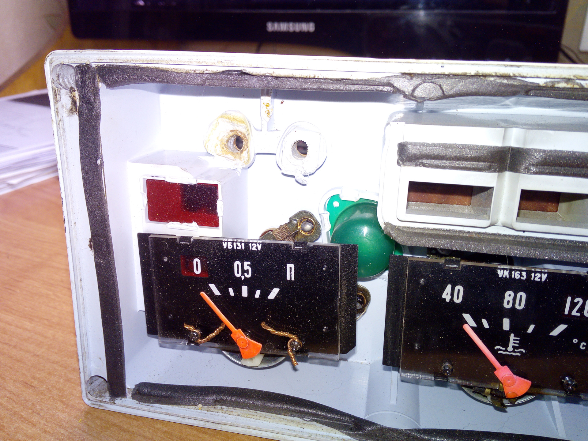 Теперь готовим приборку к замене генератора. Дело в том, что я давно хотел поставить лампочку, сигнализирующую об отсутствии зарядки аккумулятора. Для чего в имеющемся в приборке отсеке было просверлено отверстие 4,5 мм под светодиод и сам отсек был закрыт стёклышком с донорской приборки, которое хорошо видно на предыдущем фото. Светодиод был банально вклеен. Провод с минусового контакта припаян на земляную дорожку приборки, к плюсовому контакту припаян провод, пока висящий в воздухе. И в металлической пластинке шкалы приборки банальной стамеской прорубил отверстие над красным окошком.