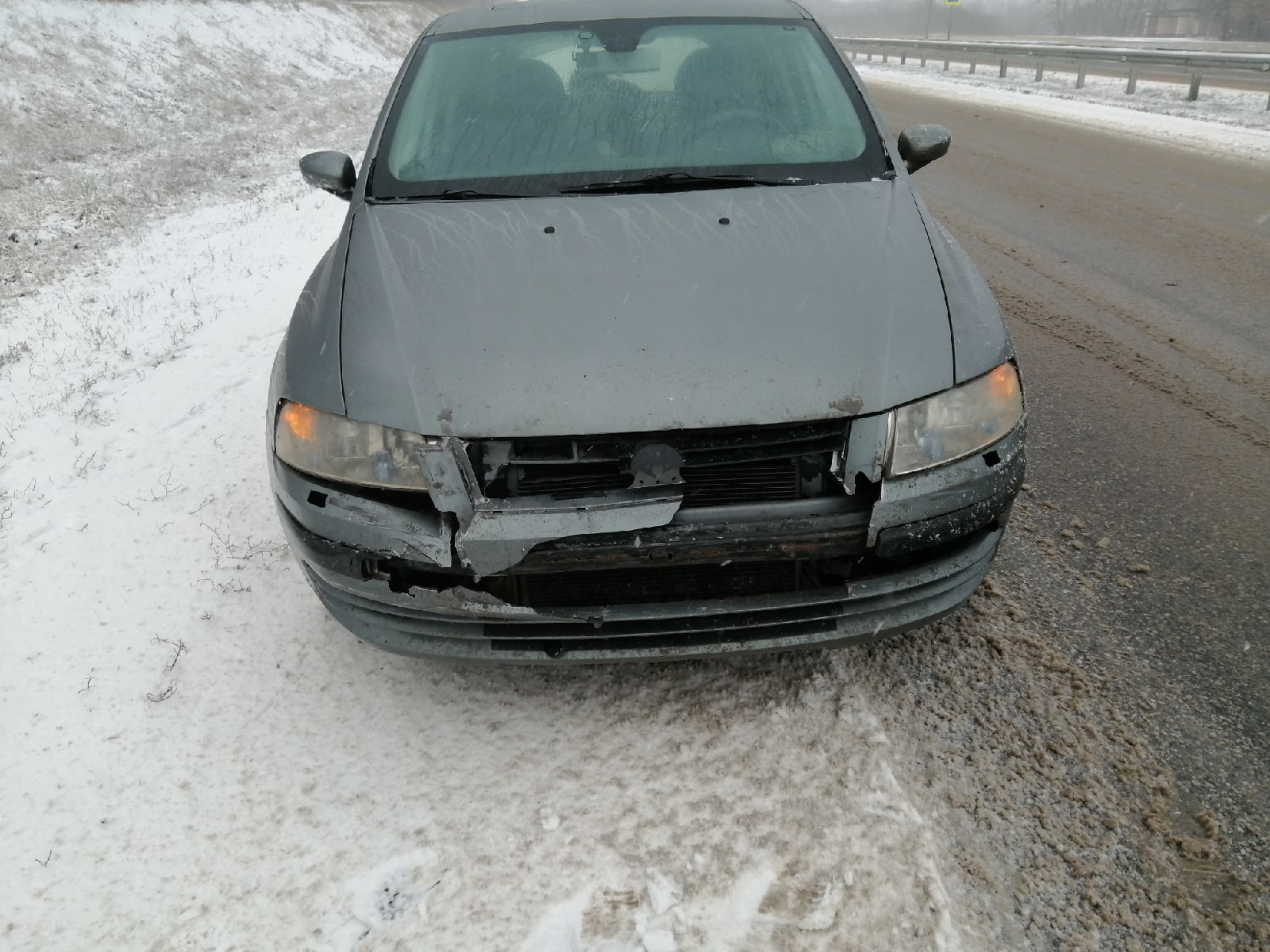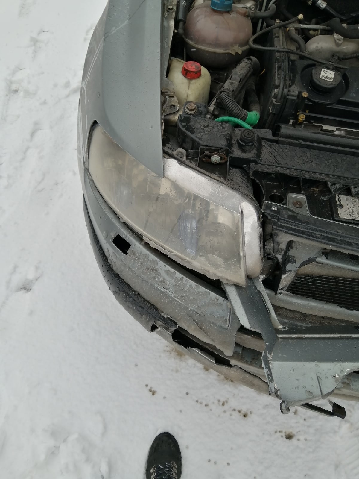 Идя по заснеженной трассе аккуратно за авто, нас подрезал добрый и бодрый БМВ. Видите ли, царю не понравилось что скорости всего 70км/ч, и холопы тупые не имея забот, плетутся словно черепахи. Взяв дюжий разгон, совсем капельку не справившись с управлением, резко поворачивая на право нас подрезает представитель немецкого авто, и славно так даёт пенделя впереди идущему французу. Оттормозившись нас заносит и так аккуратно, словно лёгкий поцелуй, отбойник передаёт привет. Француз в похожем состоянии недоумевает, а юнный представитель немецкого автопрома оказывается довольно милой на вид, но донельзя хамовитой леди. Долгое стояние, ожидание и тд описывать нет смысла. Отделались лёгким испугом, бампером, двумя фарами и радиатором кондея.