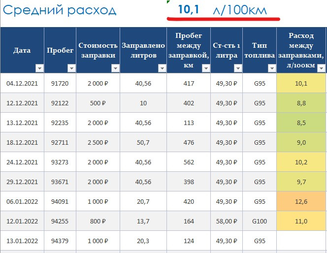 Ну вот глянул по своей табличке: средний расход с 01 мая по 30 сентября (тёплое время года) = 12,6л, средний расход с 01 ноября по 28 февраля (холодное время) = 17,4л.