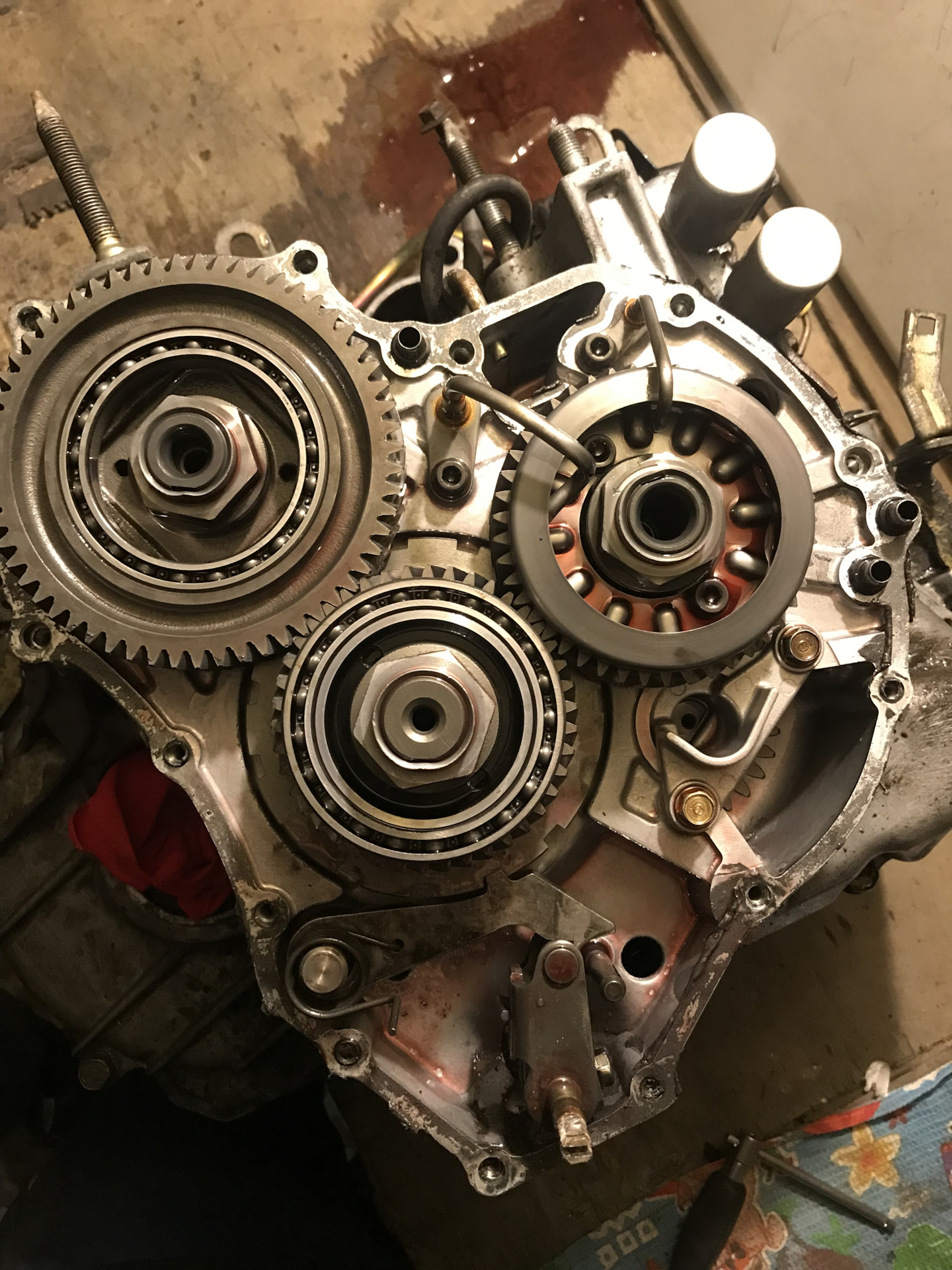 В средний корпус незабываем вставить шестерню задней передачи правильной! стороной и собираем воедино две половинки. Далее верхние шестерни на место и затягиваем гайки до усера, до мест завальцовки, у меня получилось на 1-2мм дальше.