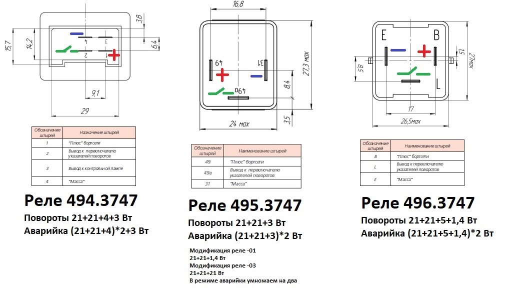 Но, как оказалось, оно не совсем нам подходит по положению контактов плюс и минус и суммарной мощности ламп. Есть реле 496.3747 вышеупомянутого производителя и оно как раз то, что нам надо. И по положению контактов и по мощности включаемых ламп. Информацию по реле поворотов от АВАР собрал в картинку, будет ниже. Зелёный — это контакт подрулевого переключателя.