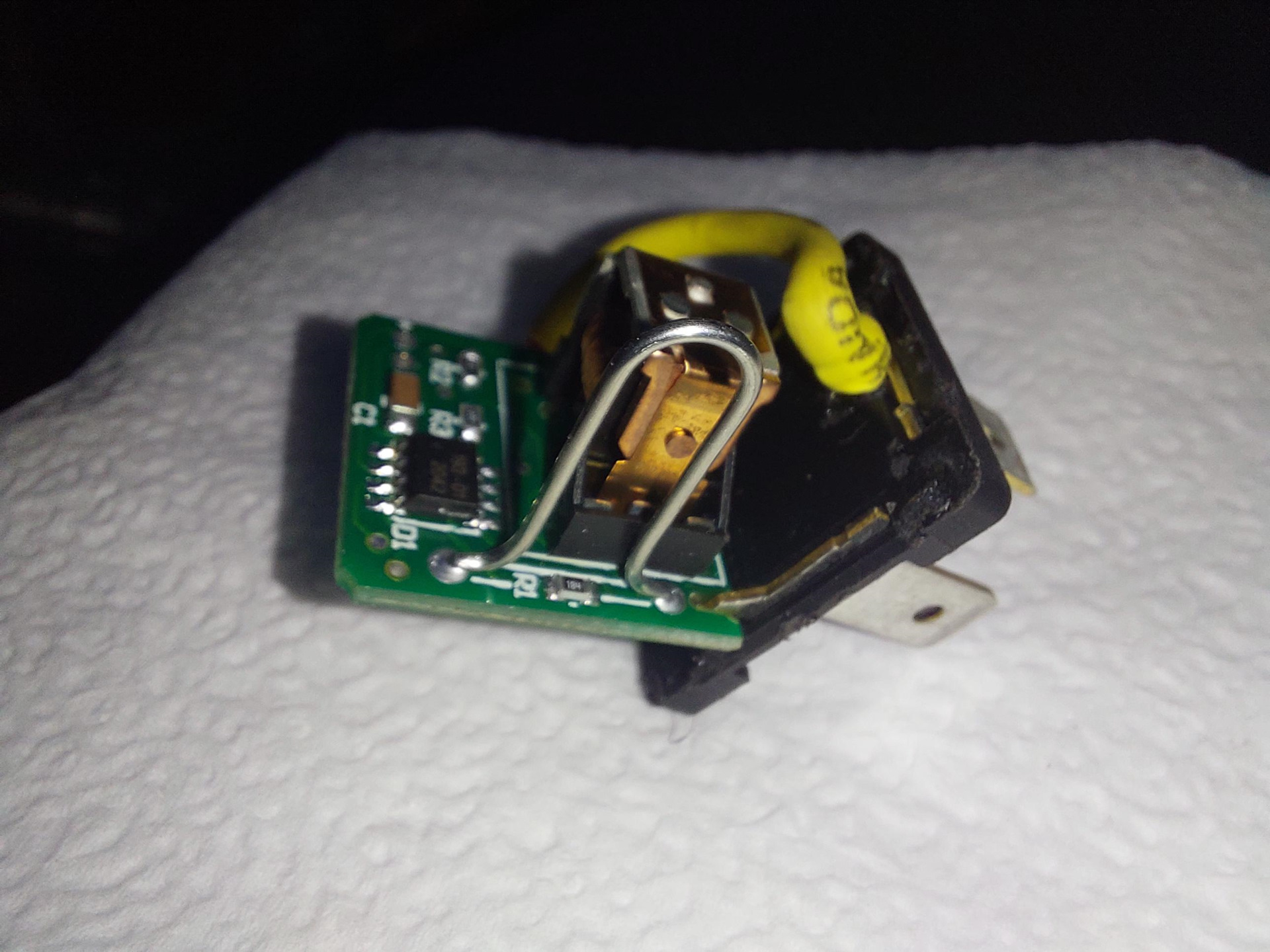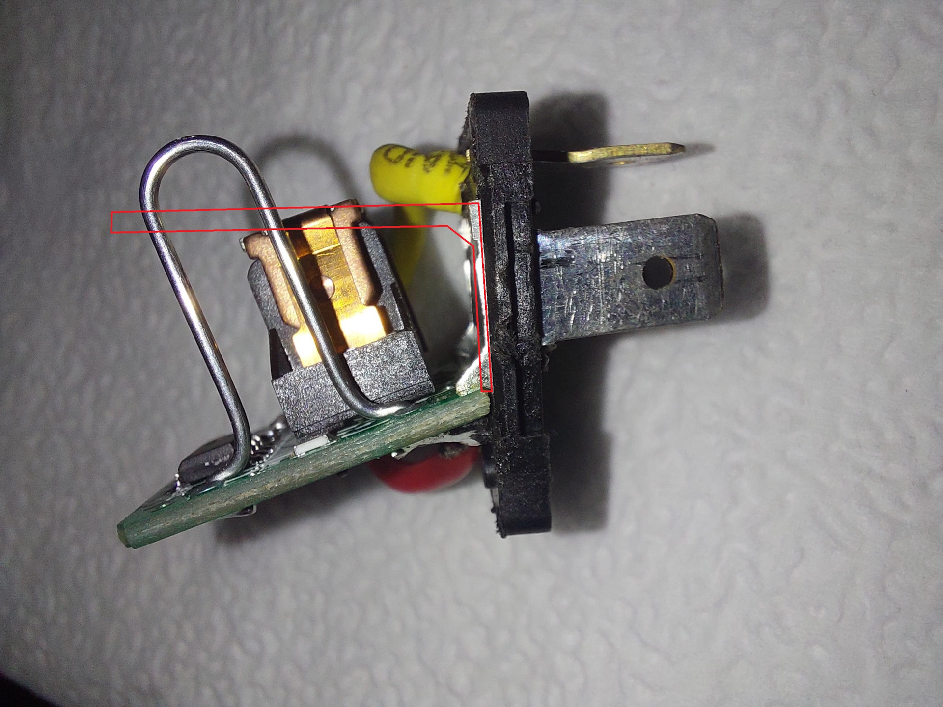 Почисть контакты и посмотри, у тебя оно залипает и залипает на пластикеножке что ближе к надписи на плате 1GN. Я накинул на пластик этот от пивной банки типо рубашки и обжал круглогубцами. За год броблем не было.