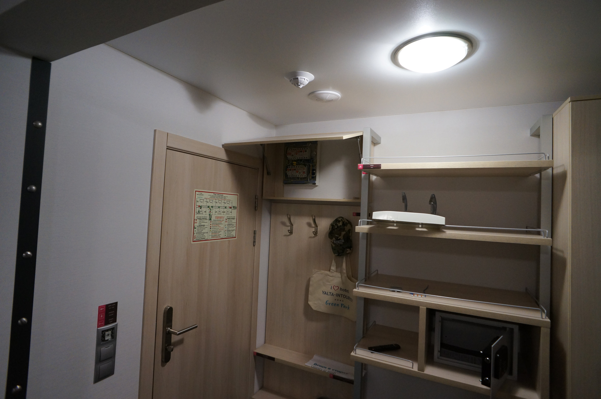 До Ялты добрались сравнительно быстро. Заселение в Интурист происходит в 14:00. Мы приехали в 16:00. На ресепшене выяснилось, что наш номер не готов. Нас попросили погулять где-нибудь пол-часика… Минут через сорок мы снова подошли на ресепшен. Администратор неуверенно ответил, что мы в принципе можем заселяться. Добрались на электрокаре до Green Park-а. Прибыв в номер мы обнаружили там электрика, пытающегося восстановить электроснабжение нашего номера… По электрике не работало вообще ничего. Не стали давить на электрика (он то в чём виноват?), мои пошли прогуляться, я с устатку остался в номере. В итоге электрик так и не смог оперативно полностью восстановить электроснабжение номера (отдельно освещение то работало, а при подаче напряжения на розетки вырубало автомат). Вины электрика в этом не было, электро-схема там не только мудрёная, но и походу косячная. На ресепшене нам предложили переселиться в 2-комнатный люкс (мы бронировали 1-комнатный стандарт). А в качестве компенсации за причинённые неудобства предложили бесплатный ужин в ресторане. Пообещали, что помогут с переездом (вещи я уже успел затащить в обесточенный номер). Не стал я дожидаться помощников, перетаскал вещи в соседний корпус сам. Напомню, действие происходило в Green Park-е, где несколько отдельных корпусов без лифта.