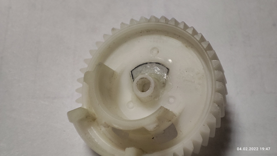 Ремонт шестерни с помощью супер клея и усилением её в центре кусочком ПВХ толщиной 0,4мм. Хорошо видно контур запчасти.