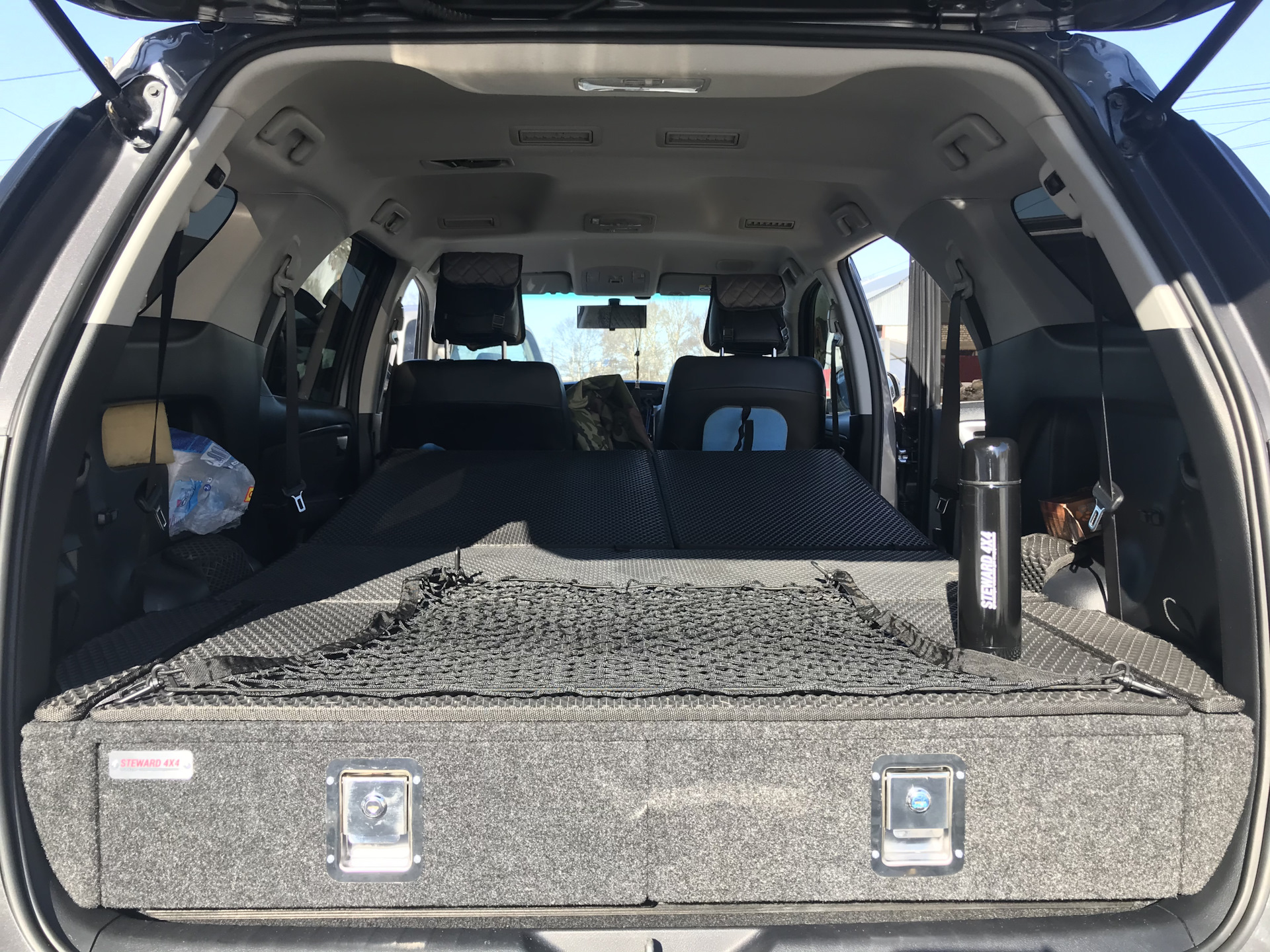 Ну ладно думаю с кем не бывает все мы люди, кладовщик извинился, помог я ему красиво упаковать чей-то органайзер коробку то на первом тютю, отдал свою, поставил: смотрится красиво, достойно, все сделано четко тютелька в тютельку, поначалу думал карпет будет грубоват на ощупь (видел у товарища в УАЗике) нет приятно на ощупь, единственный минус когда ставишь дополнительные полки они длинные их не сложить как книжку если они вставлены в петли( уже позже когда заказал и он плыл ко мне читал на драйве что заказывали укороченные) так что кто надумает такую комплектацию присмотритесь к совету ребята идут навстречу на раз два!, в каждый отсек идёт коврик эва, только придётся один из ковриков который идёт в большой отсек изогнуть так как идёт в полу углубление для ног пассажирам третьего рядя. Крепится он к петлям в полу для третьего ряда.
