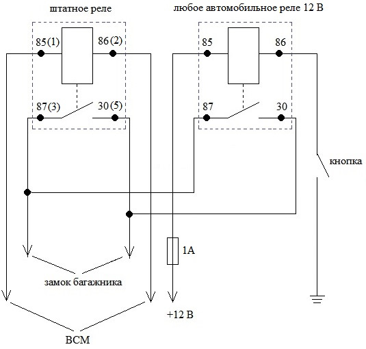 2. Кому надо "ещё проще" — могут впаивать провода прямо в рабочее реле, но делать этого я не рекомендую. Реле — тонкий электромеханический элемент, и неумелая впайка приводит к тому, что гибкость контактов нарушается и цепь перестанет замыкаться. Симптом — багажник открывается с кнопки, но не открывается с брелка. Значит, скорее всего, неумелой пайкой было повреждено реле.