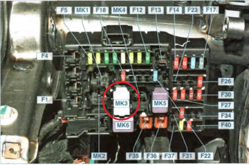 3. В крышке блока предохранителей высверлил отверстие под кнопку (удобно сверлить ступенчатым сверлом или пером на 22 мм). В колодку вставил заводское серое реле, заблаговременно извлеченное из блока предохранителей (на схеме "МК3").
