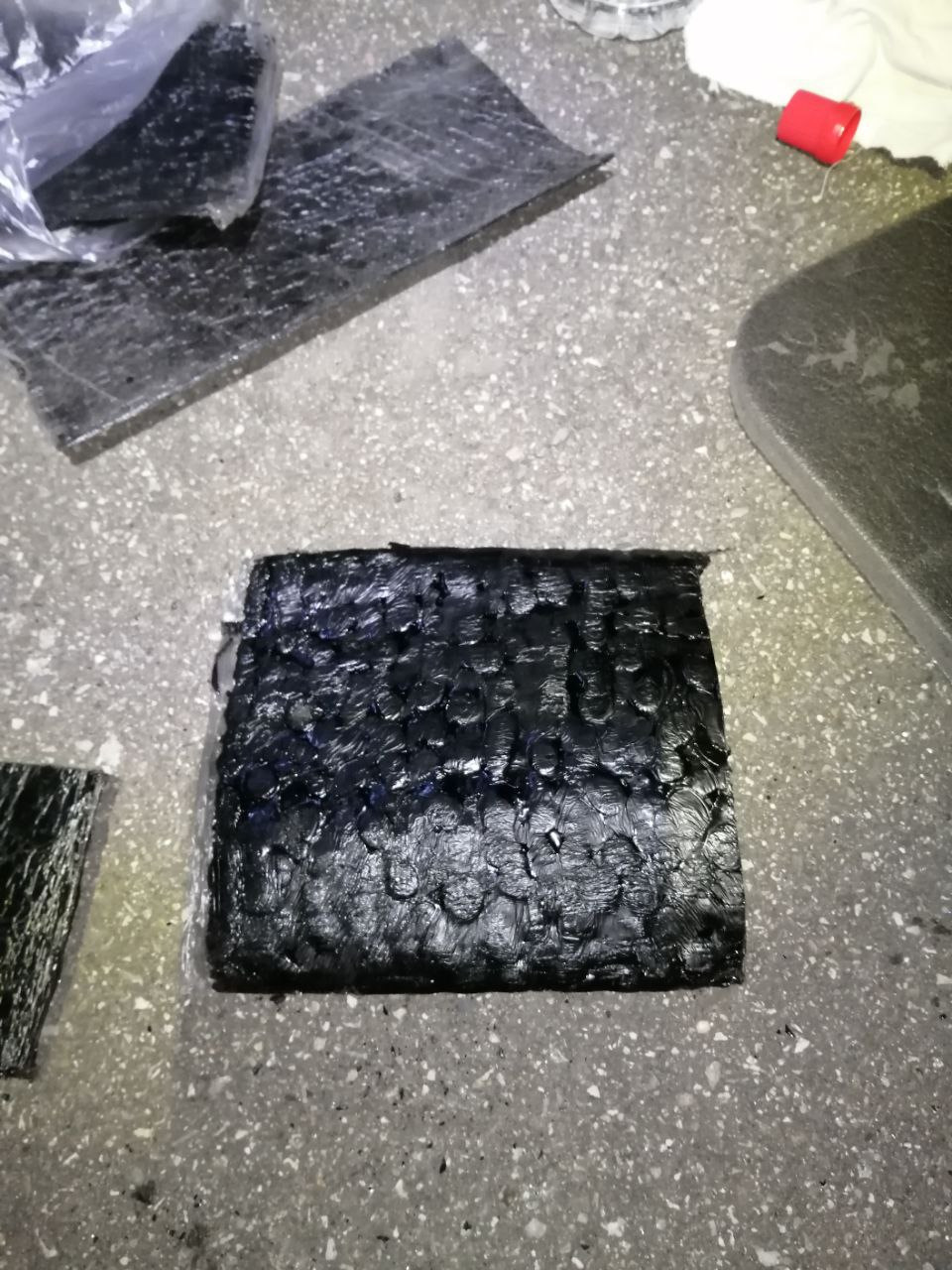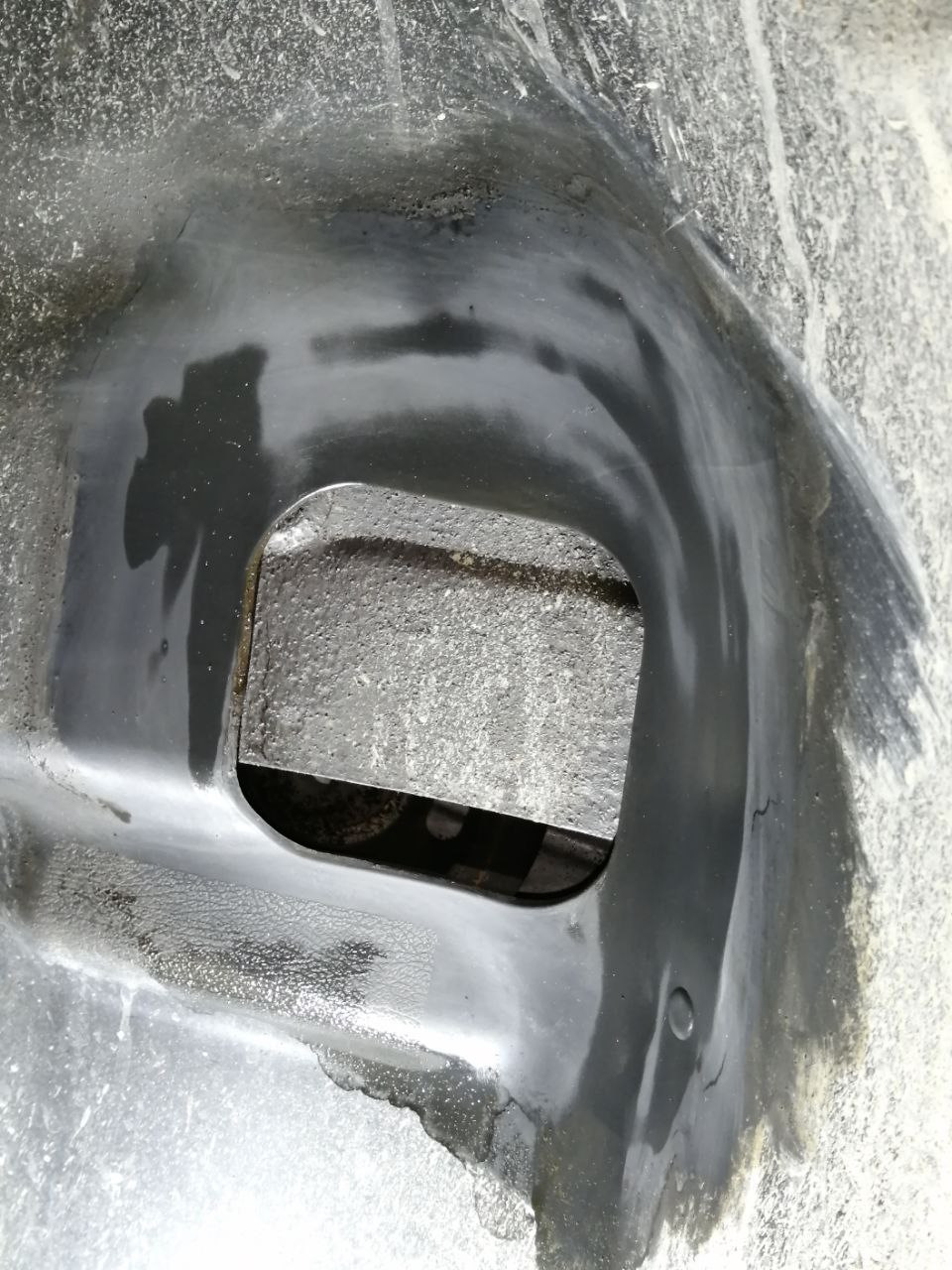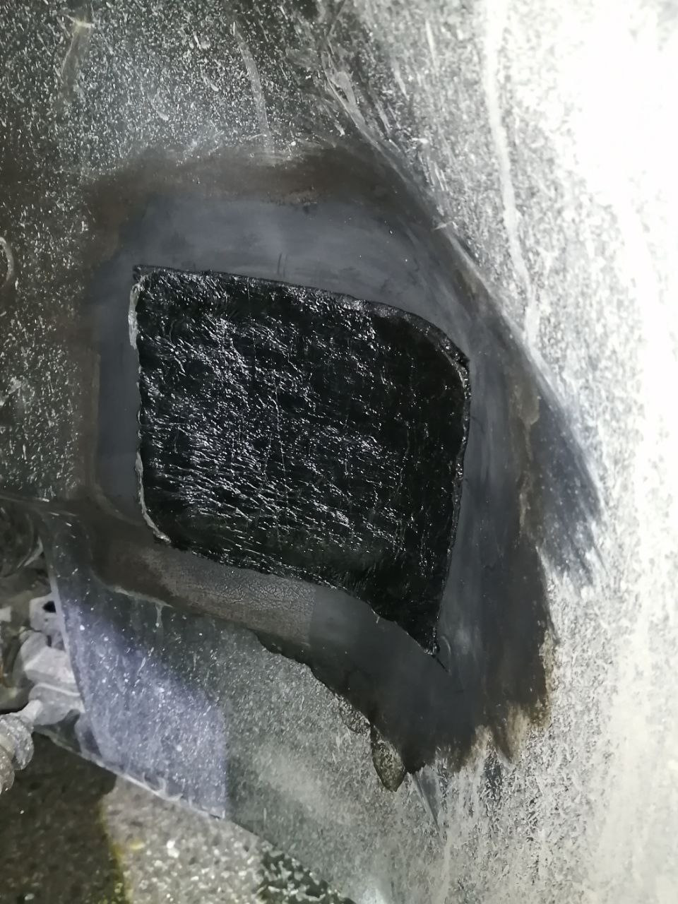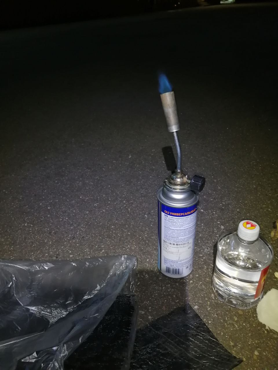 Чтобы заклеить отверстия я вооружился обрезками строительной рулонной гидроизоляции, газовой горелкой (феном было бы удобнее) и обезжиривателем.