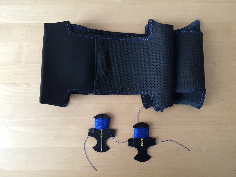 Сливаем воду и начинаем обшивать. Главное здесь совместить стыки перфорированной кожи и гладкой, чтобы ровно все сшилось. Предварительно посмотрите как стыкуются боковины кожи там где кнопки, чтобы не начать обшивать руль задом на перед. Шов — "спортивный". В паре мест я перетянул шов, но для первого раза получилось норм. Ничего не проклеивал клеем — отставил так. Потом руль сох до утра.